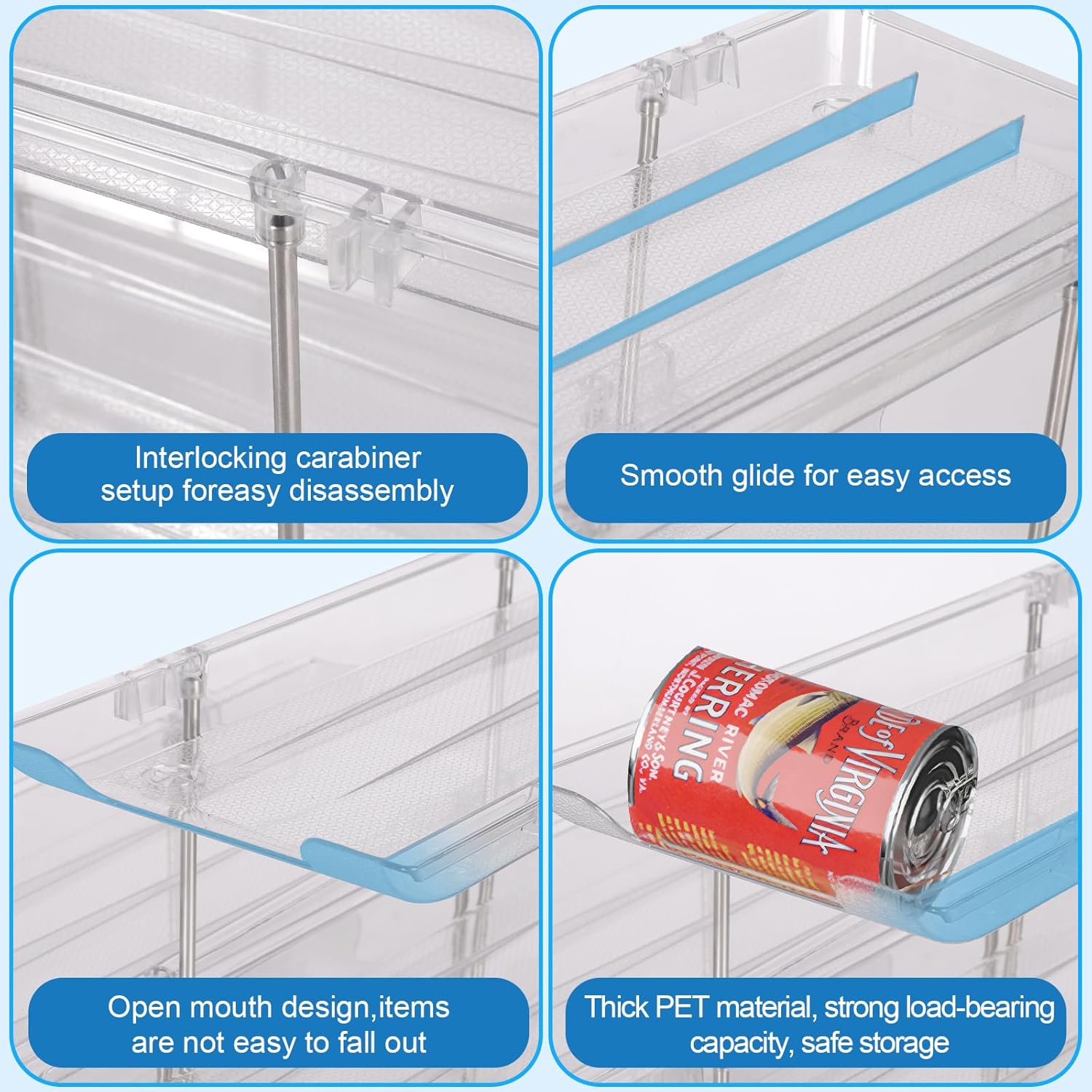 - 3️⃣【Auto-Rolling】The pantry organizers and storage adopts a tilted design. When you take a can, the can at the back will automatically slide forward. The open design in the middle allows you to take it without restriction and is easy to use.