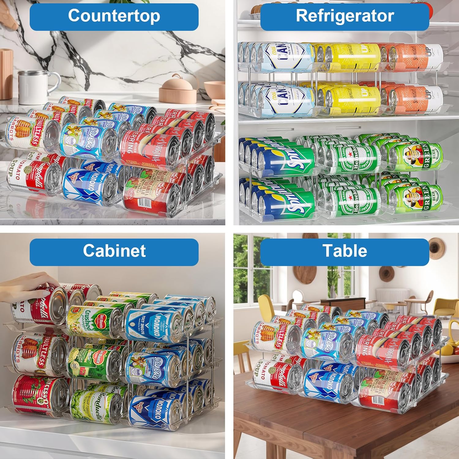 - 5️⃣【Easy to clean, easy to install】The waterproof and thick PET makes the can organizer pantry clean in seconds without leaving stains or odors. One person can easily assemble a sturdy pop can organizer without tools. Interlocking compact design, no shaking after filling the can.