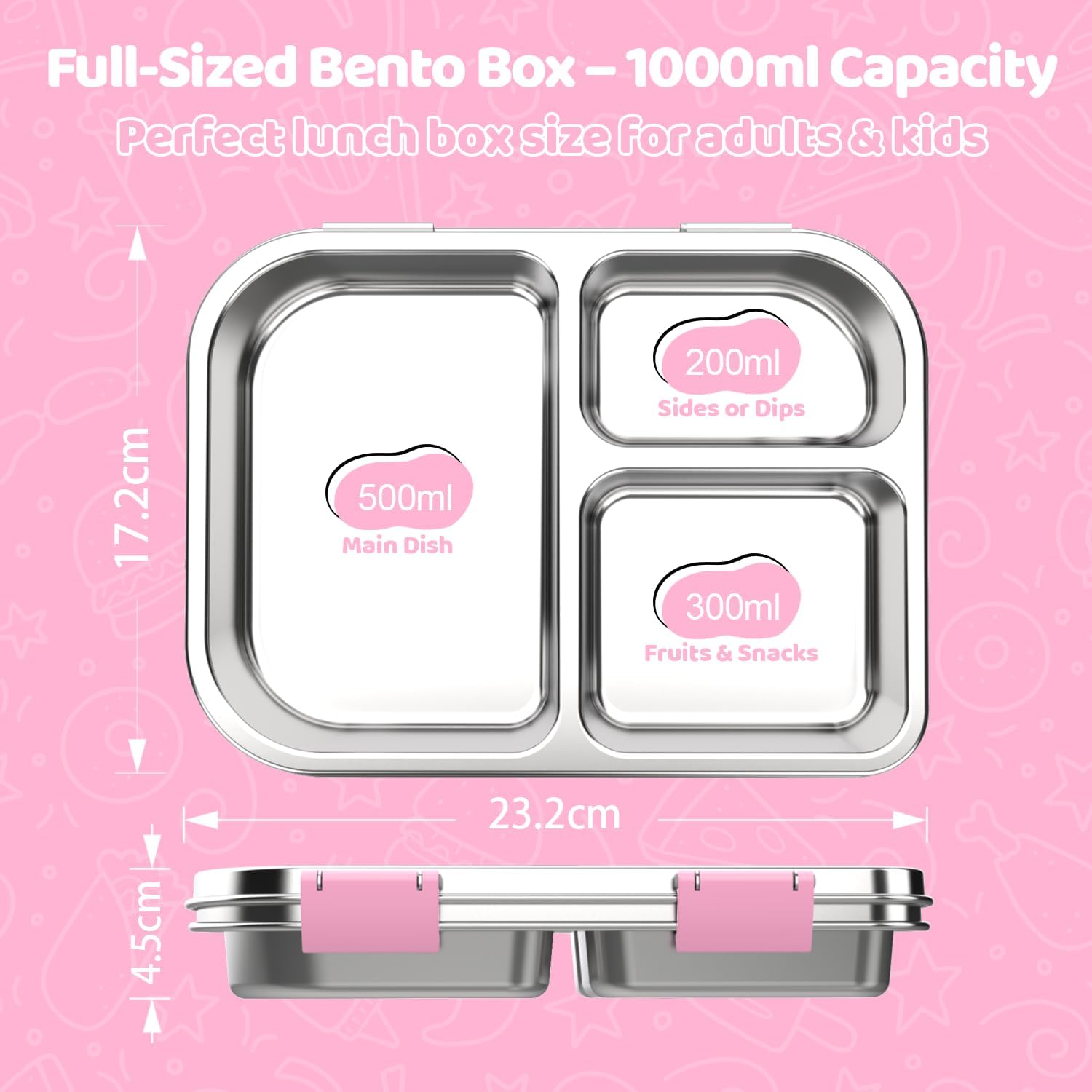 Stainless Steel Lunch Box 1000ml - 3 Compartment Bento Box for Kids & Adults, Leakproof Food Container, BPA-Free Metal Lunch Box with Silicone Seal, Eco-Friendly/Dishwasher Safe (Pink)
