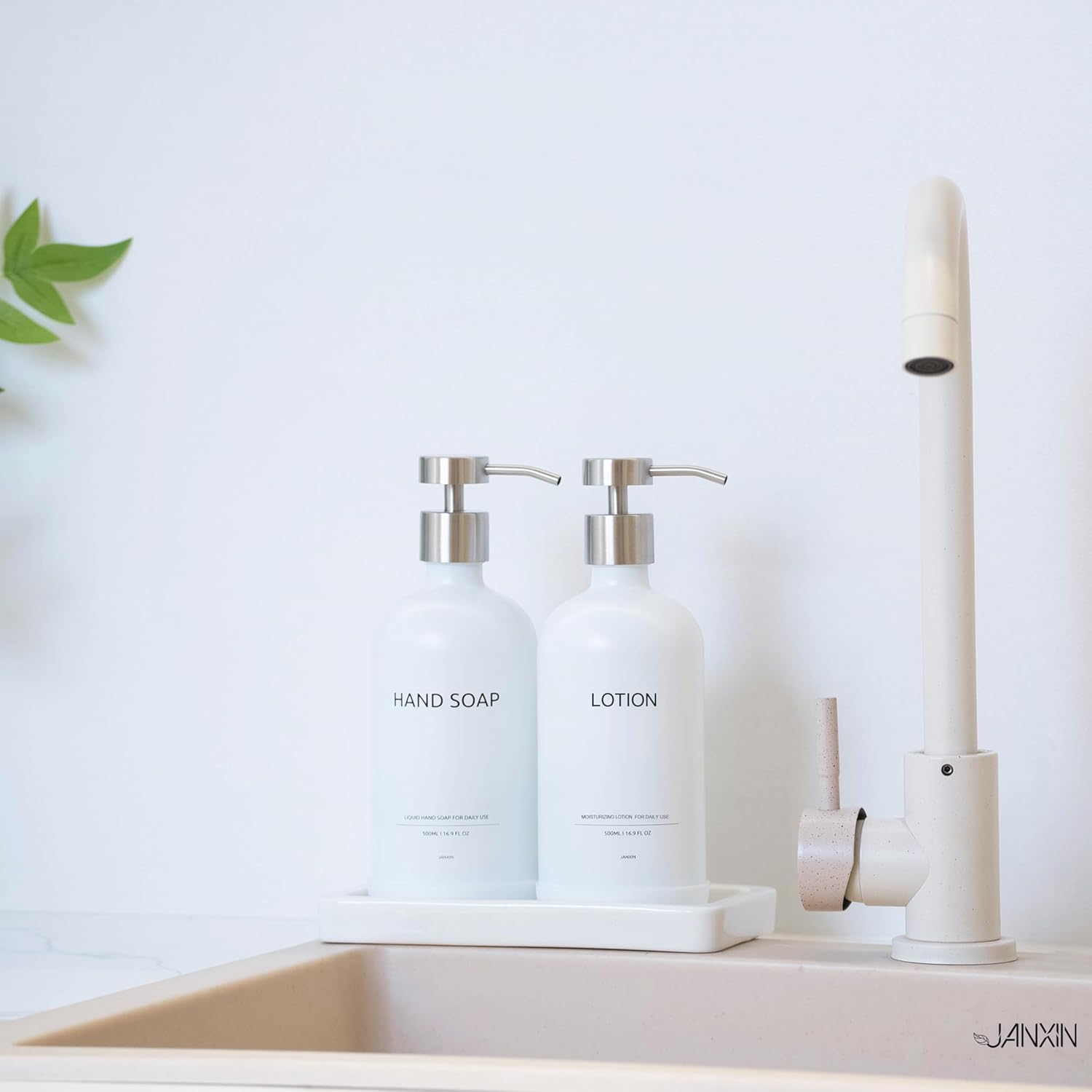 - LUXURY SOAP DISPENSER SET: Transform your kitchen or bathroom decor instantly with our luxurious kitchen soap dispenser set, This set includes two 16.9 Oz/500 premium glass bottles with 2CC stainless steel pumps, one ceramic tray . Great for upgrading your kitchen and bathroom countertops with this stylish soap dispenser set