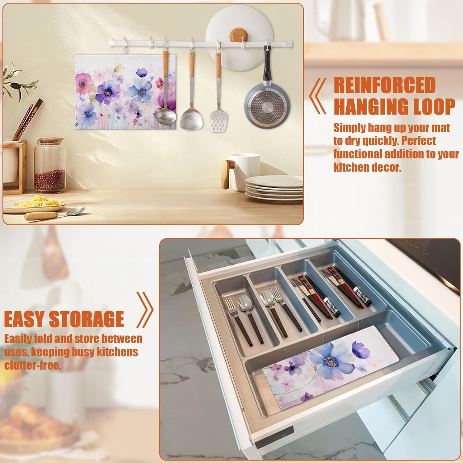 Watercolor Flowers Dish Drying Mat for Kitchen Counter Microfiber Absorbent Dish Kitchen Drying Mat Draining Reusable Washable for Dishes/Utensils/Counterto