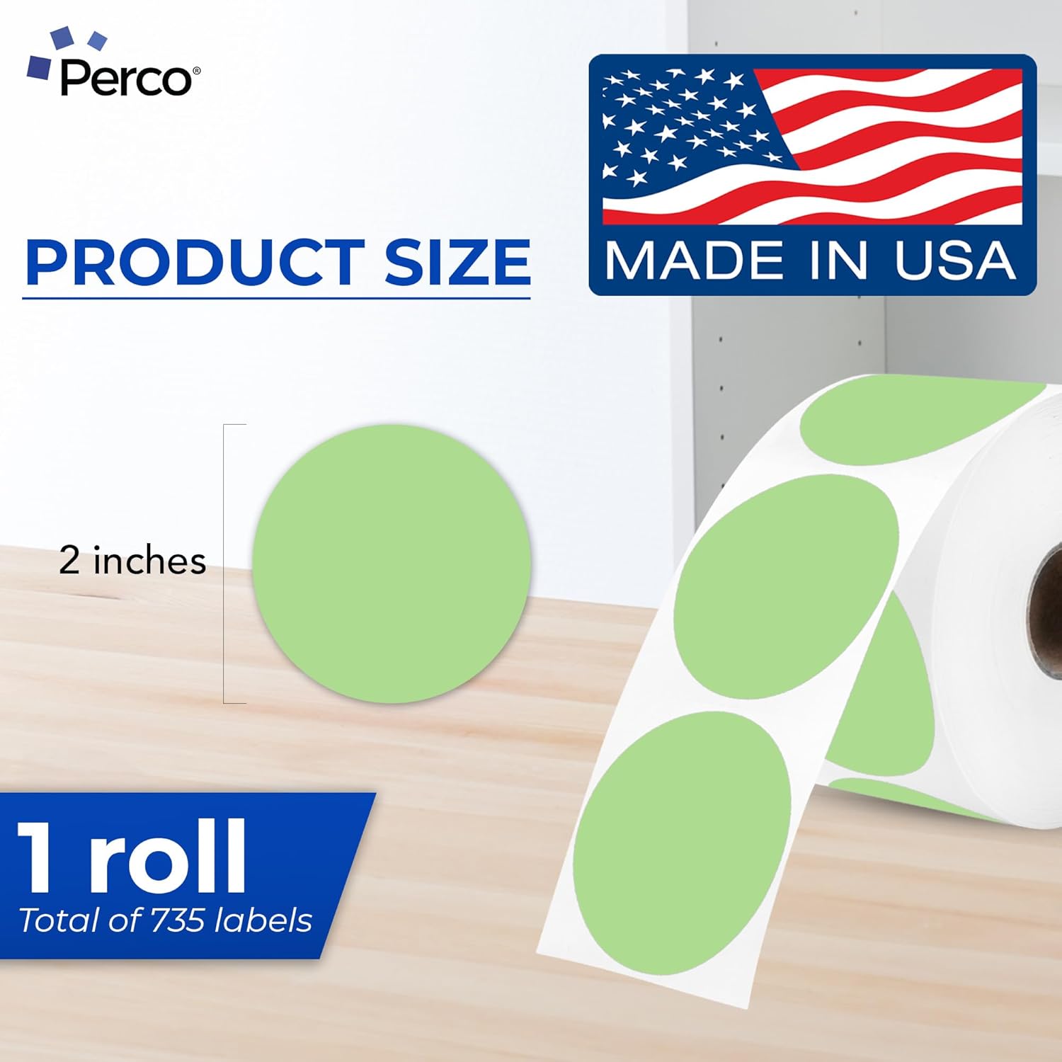 Perco Green 2-Inch Perforated Circle Dot Thermal Sticker Labels — 735 Stickers/Roll, Direct Thermal Printer Compatible—with Permanent Adhesive for Organizing, Color Coding, Bin Labeling—Made in USA