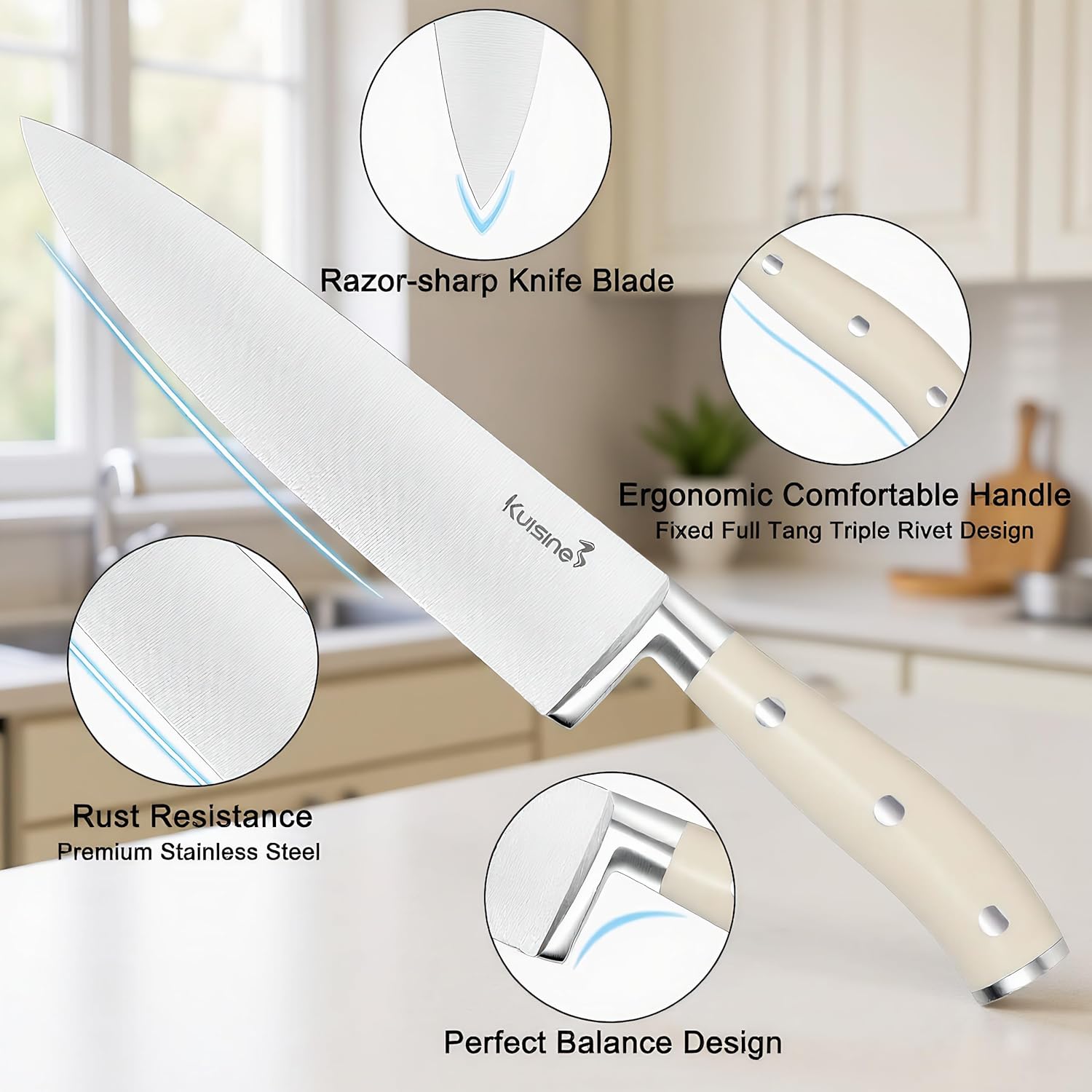 KUISINE Knife Set High Carbon Stainless Steel Sharper Blade Ergonomic Handle,Knife Block Set with Built-in Sharpener 2025 Upgraded (Ivory Pro Acacia,15PCS)