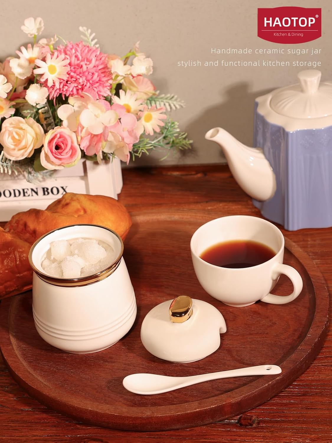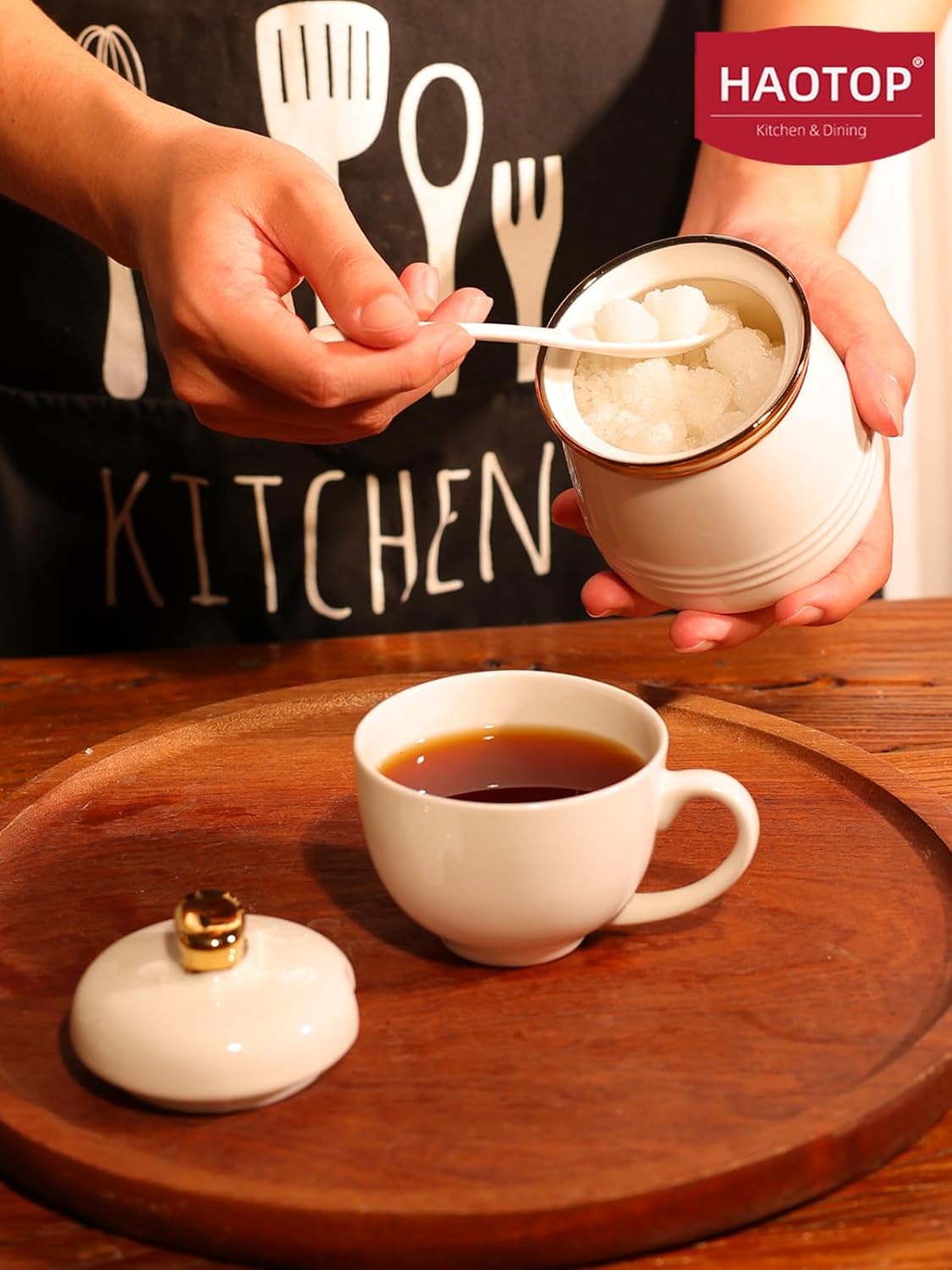 HAOTOP 12oz Sugar Bowl with Lid and Spoon,Simple Ceramic Sugar Jar Sugar Container Sugar Dispenser Coffee Bar Accessories, Modern Kitchen Countertop Canisters, White