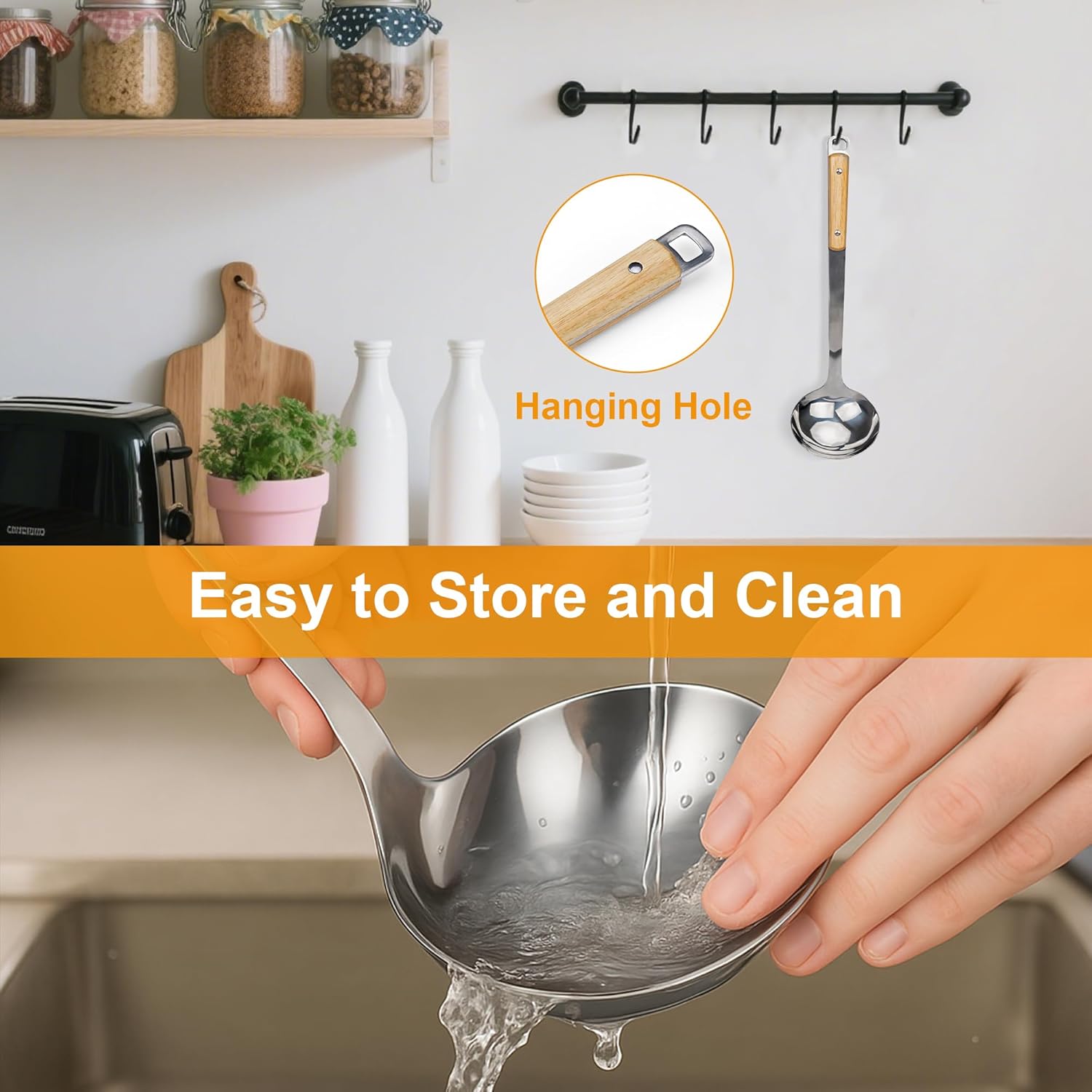 - Ergonomic, Heat-Resistant Wooden Handle: The metal ladle is designed with a comfortable, non-slip grip and heat-resistant handle, and it offers safe and effortless serving, even when handling hot liquids straight from stovetops or ovens.