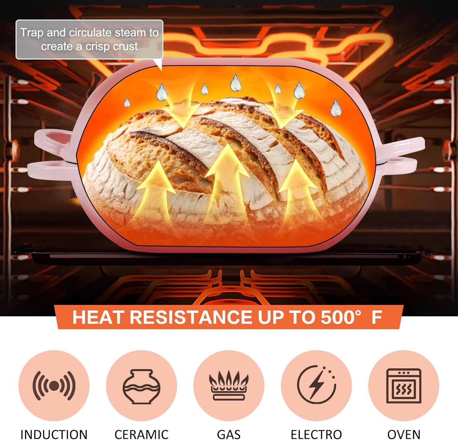 - Feature: The oval dome lid of this oval bread oven traps steam released during baking to produce a caramelized, crispy crust, preventing the crust from curdling, drying out or baking too quickly before rising. The ergonomic handles make lifting easy and comfortable