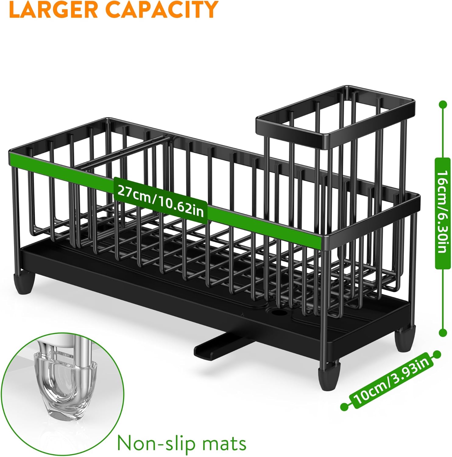 - 【STABLE DRAIN TRAY & AUTOMATIC DRAINAGE】The drain tray is fixed to the frame, so it won't come loose and drop when is use. Sloped design ensures fast drainage. This sink caddy is great for holding all the cleaning things and keeping water off the counter.