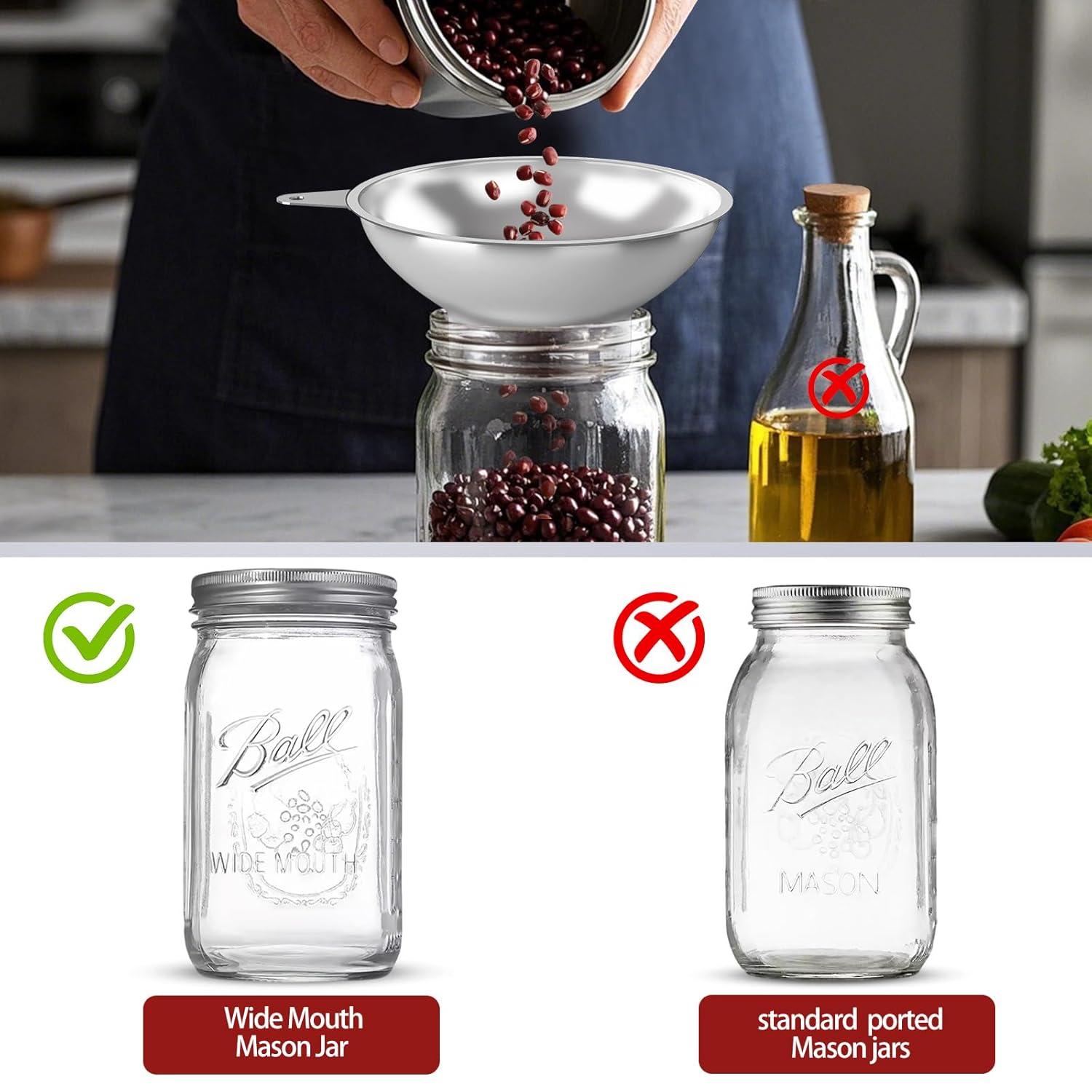 - Funnel base seamlessly locks onto wide-mouth jars , creating a spill-proof seal for mess-free preserving. Effortless precision when filling jams, pickled veggies, or fermented goods – no more rim drips or misaligned pours.
