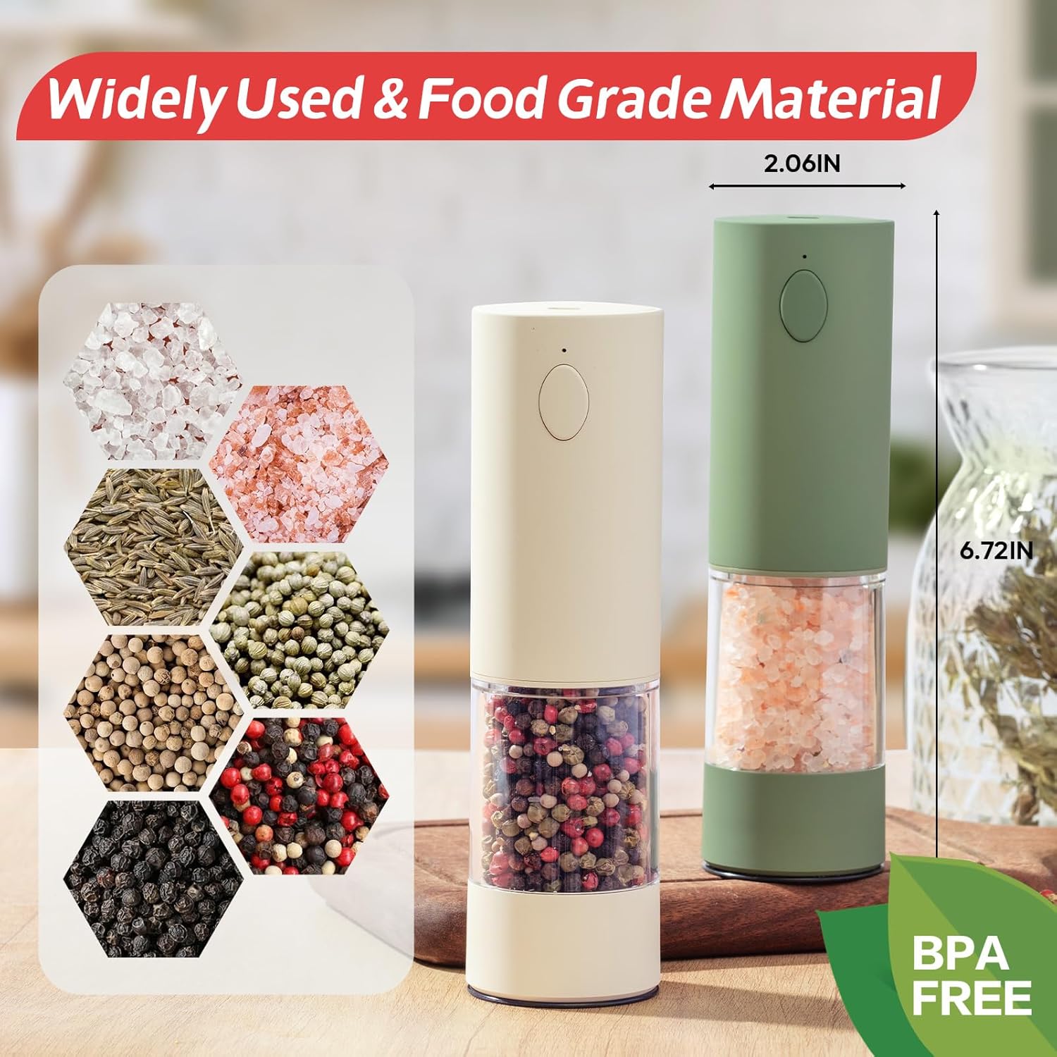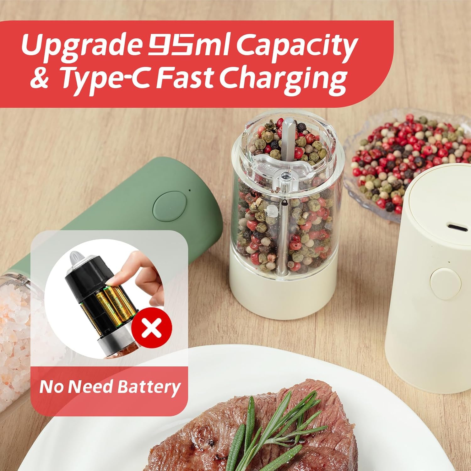 - Effortless One-Hand Operation & Arthritis-Friendly Design - Designed for busy kitchens and sensitive hands! Simply press the top button with one hand to grind spices effortlessly—no twisting or gripping required. Perfect for seniors, arthritis sufferers, or multitasking cooks. The USB-C rechargeable system eliminates disposable batteries (fully charges in 2 hours!), saving costs and reducing waste