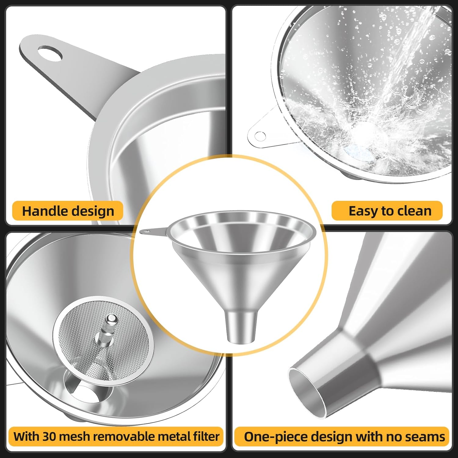 - Set of 2 Sizes for Versatile Use – Includes a large funnel (4.5" w+3.6" h+ 0.8" mouth) and a small funnel (3.5" w+ 2.5"h+ 0.55" mouth)and Stainless Steel Strainer to fit a variety of bottles, jars, and containers. Perfect for both wide-mouth and narrow-mouth applications.