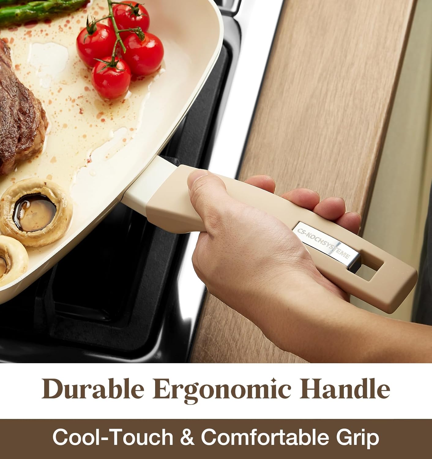 KOCH SYSTEME CS Nonstick Grill Pan for Stove Tops, 11 Inch Square Frying Pan with Lid, Ultimate Ceramic Coating Grill Skillet with Bakelite Handle, Induction Griddle Pan, PFOA Free, Cream White