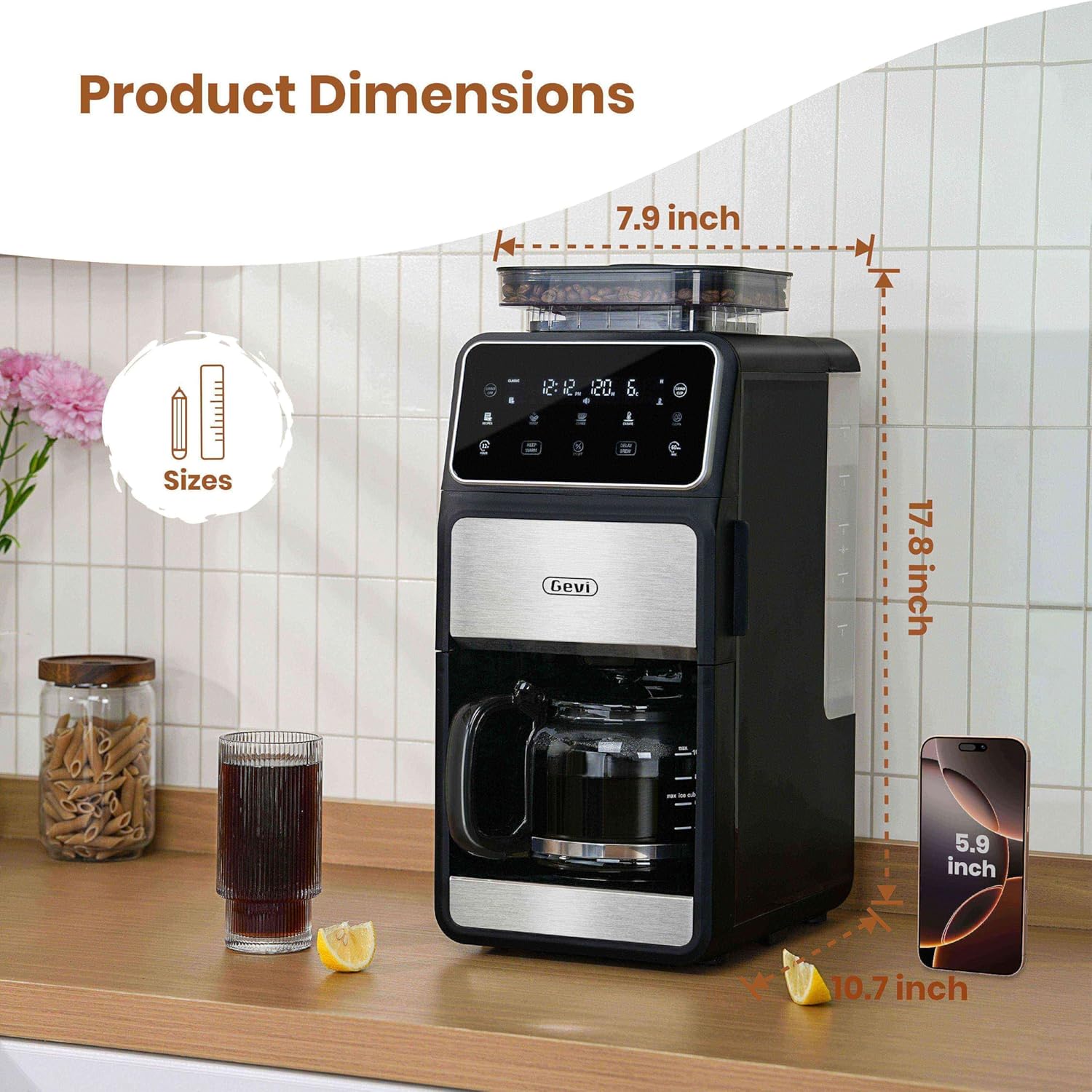 Gevi 10-Cup Grind & Brew Coffee Maker with Built-in Burr Grinder – Programmable Touch Screen, 4-Hour Keep Warm, Permanent Filter, Drip Coffee Machine for Home & Office