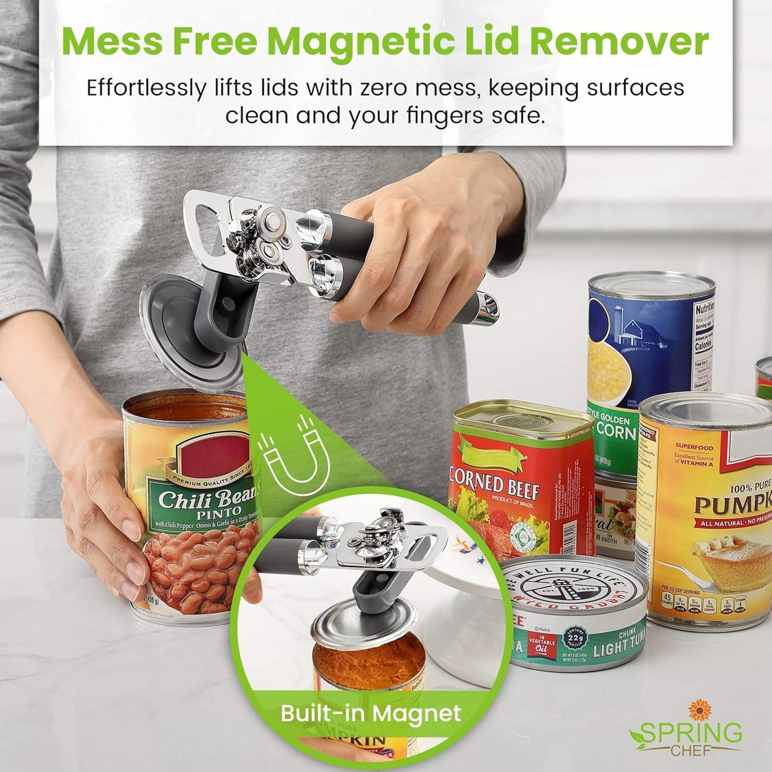 Spring Chef Stainless Steel Can Opener - Manual with Soft Grip Handles, Easy Turn, Heavy Duty Hand Can Openers for Seniors with Smooth Edge - Magnetic Lid Remover - Gray