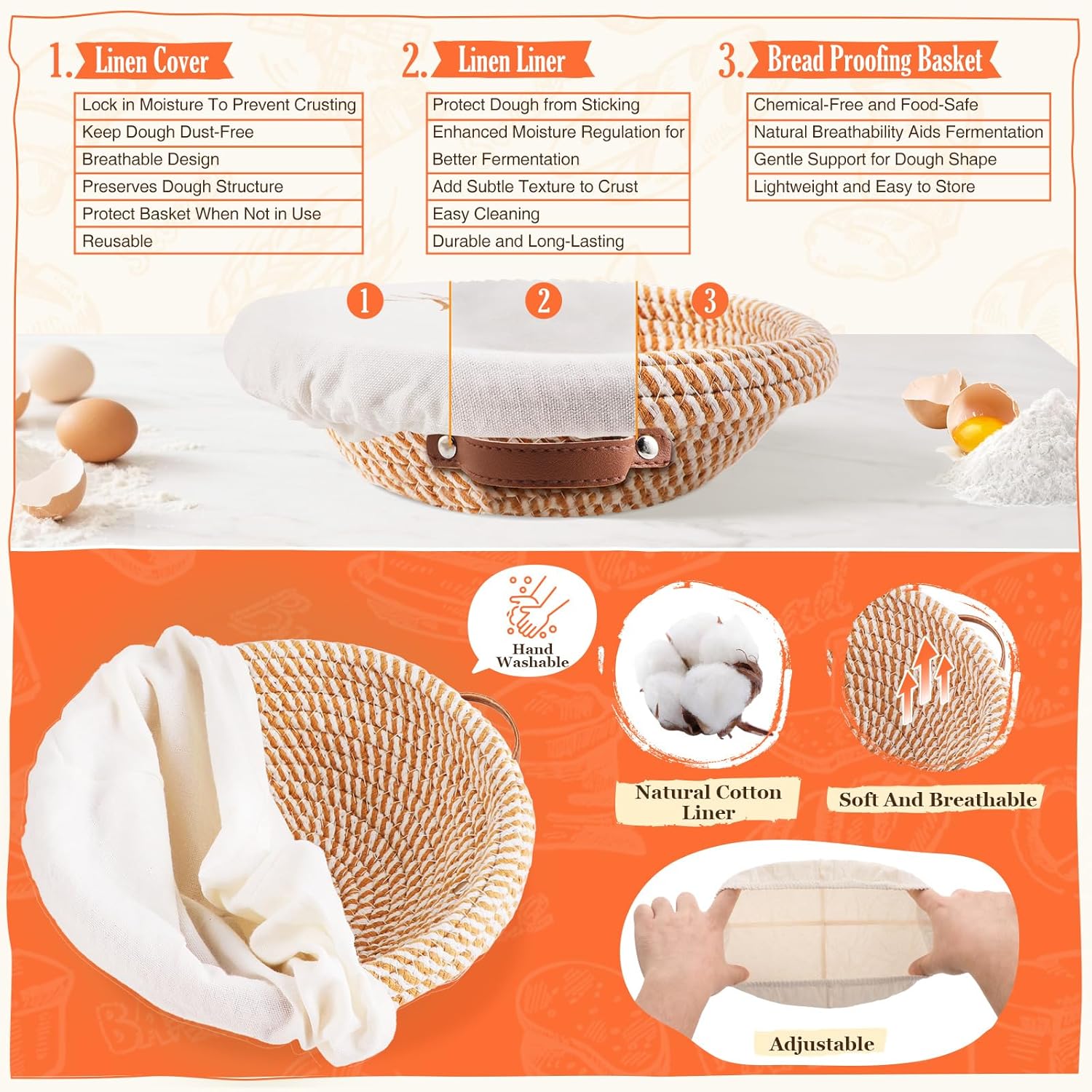 - 🌿CREATE STUNNING SOURDOUGH EVERY TIME - Our premium bread proofing baskets are crafted from high-quality cotton rope, non-toxic, BPA-free, and free from harmful chemicals, ensuring complete safety for food contact. They’re also easy to clean, which is important since I bake bread regularly. The included all-natural linen liner provides a completely chemical-free, non-stick surface for consistently perfect loaves. With this professional bakery supplies set, you'll be amazed at the restaurant-quality bread you can create at home.