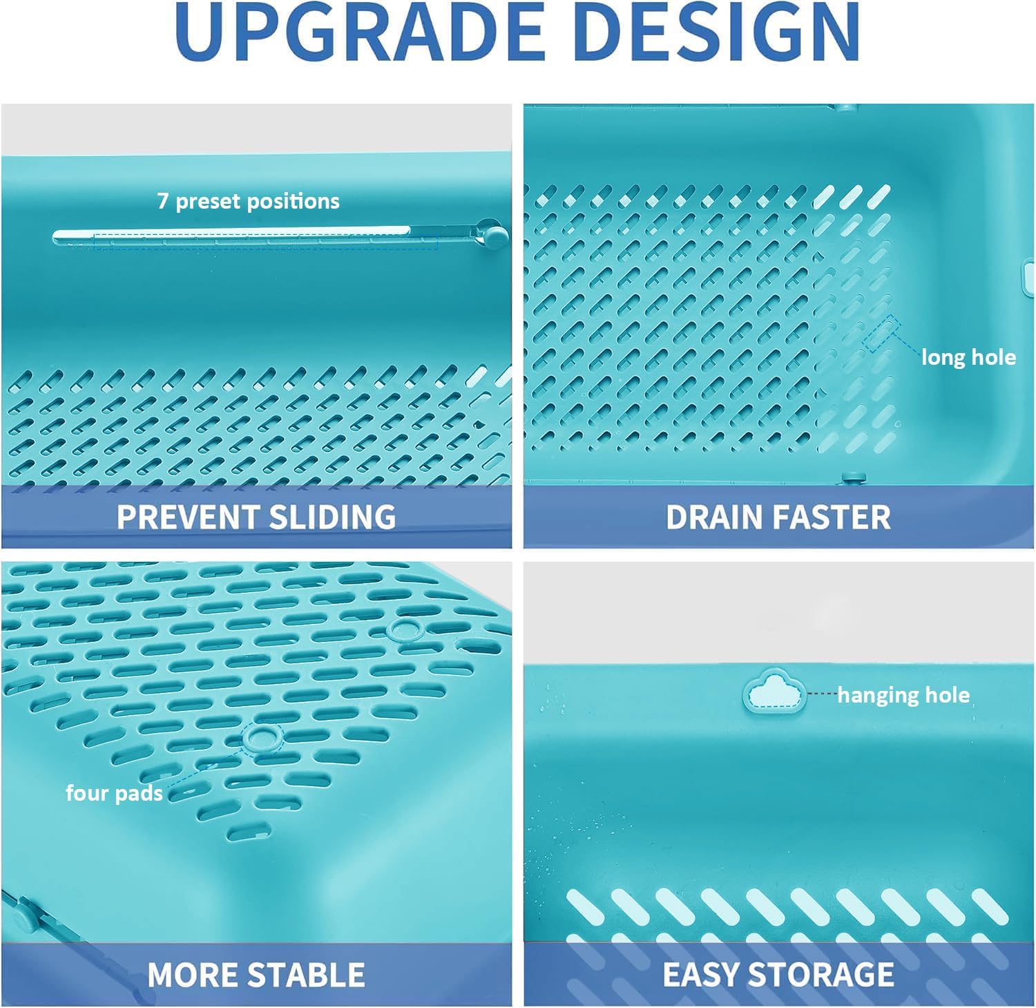 - LASSHSWA upgrade the colander, 7 preset positions - PREVENT SLIDING, long hole - DRAIN FASTER, four pads - MORE STABLE, hanging hole - EASY STORAGE.