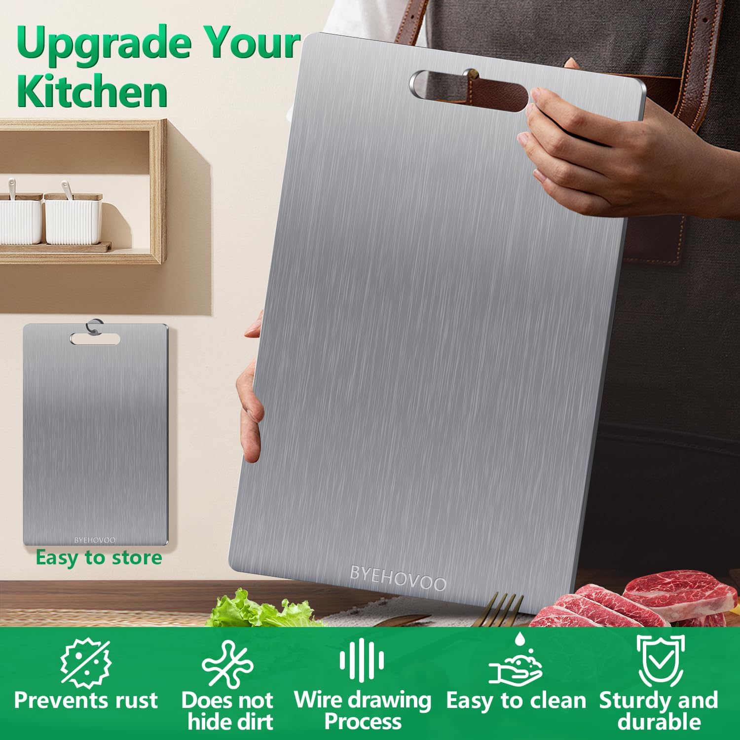 - 【Multi-Functional & Space-Saving】Double sided titanium board as a stylish serving tray for cheese/charcuterie.Double-Sided Use for versatile use.Slim profile stores vertically to save kitchen space,easy storage.Perfect gift for mom,dad,men,women,girls and boys for Anniversary Day, Father's Day,Mother's Day,Christmas Day, Thanksgiving Day, Valentine's Day.If you have any questions or anything you feel unsatisfied, please flee free to contact us via amazon. BYEHOVOO team will happy to solve for you within 8 hours.