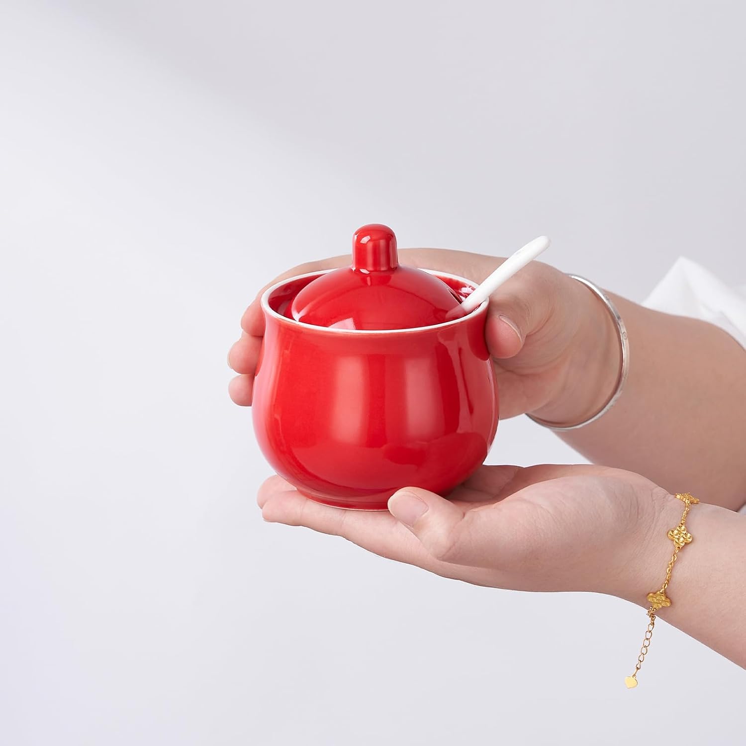 Ceramic Sugar Bowl with Lid and Spoon, Red Porcelain Sugar Salt Pepper Storage Jar, 8 Ounces