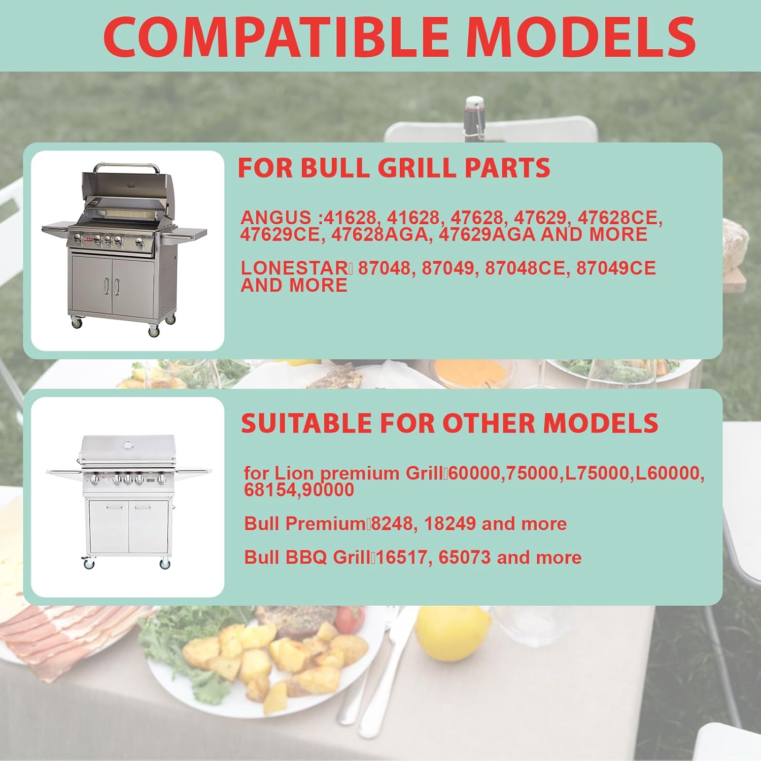 • Compatibility: Designed specifically for Bull Grill 4 Burner 30 Inch Angus 47628 41628 41629 47628AGA 47629AGA 47629CE 47628CE and more,for Bull Premium Grill 18248 18249 etc., for Bull Outlaw Grill 26039 26039CE 26038 26038CE and more, for Bull Lonestar Grill 87049 87049CE 87048 87048CE and more,compatible with the original Bull part number 16517 65073 and more.
