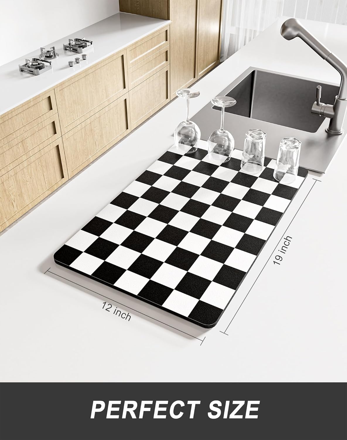 Rnivvi Dish Drying Mat for Kitchen Counter, 12 x 19" Cute Checkered Absorbent Draining Pad, Non-Slip Heat Resistant Coffee Bar Mats for Coffee Machine Station Accessories, Black White Dish Rack Pad