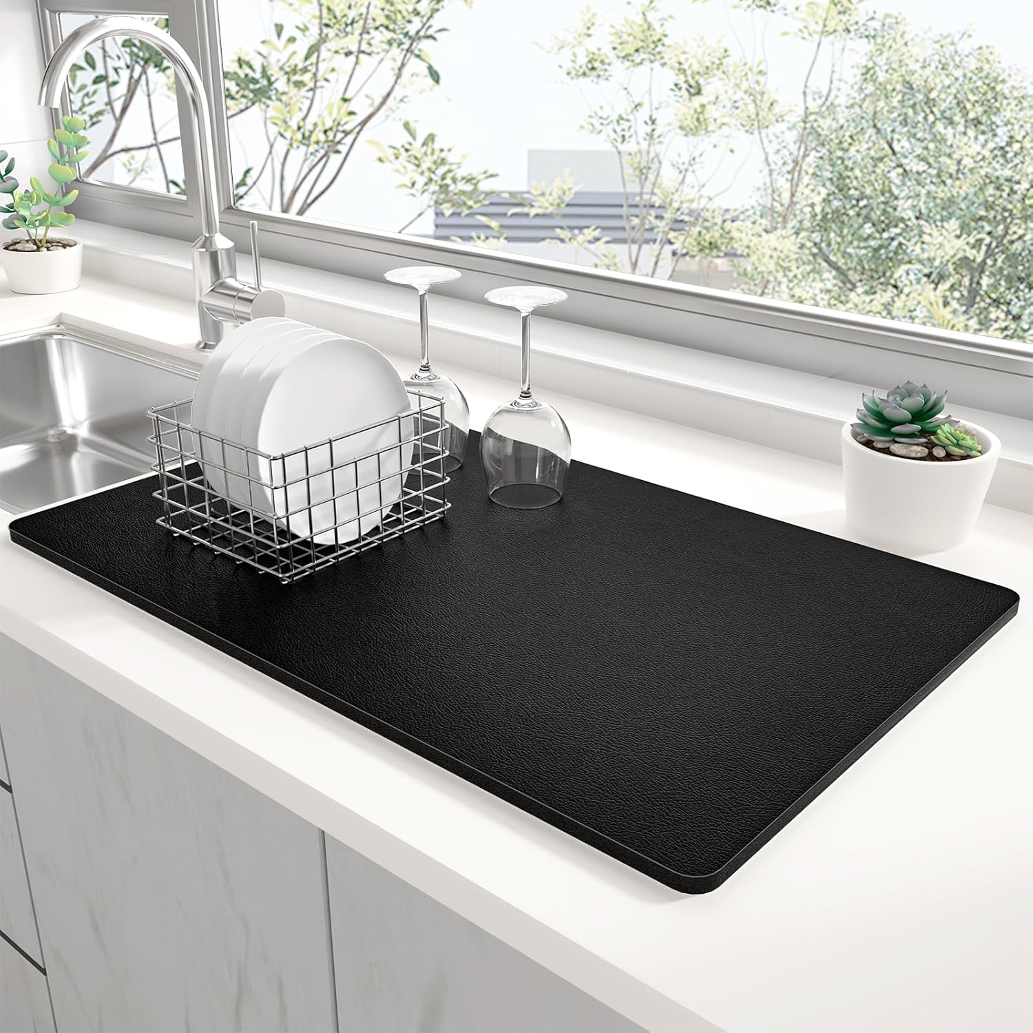 - Superior Water Absorption: Dish drying pad is crafted with highly absorbent advanced nano material for maximum water absorption, efficiently drying dishes, glasses, and cookware instantly. The heat-resistant surface protects your countertops from damage
