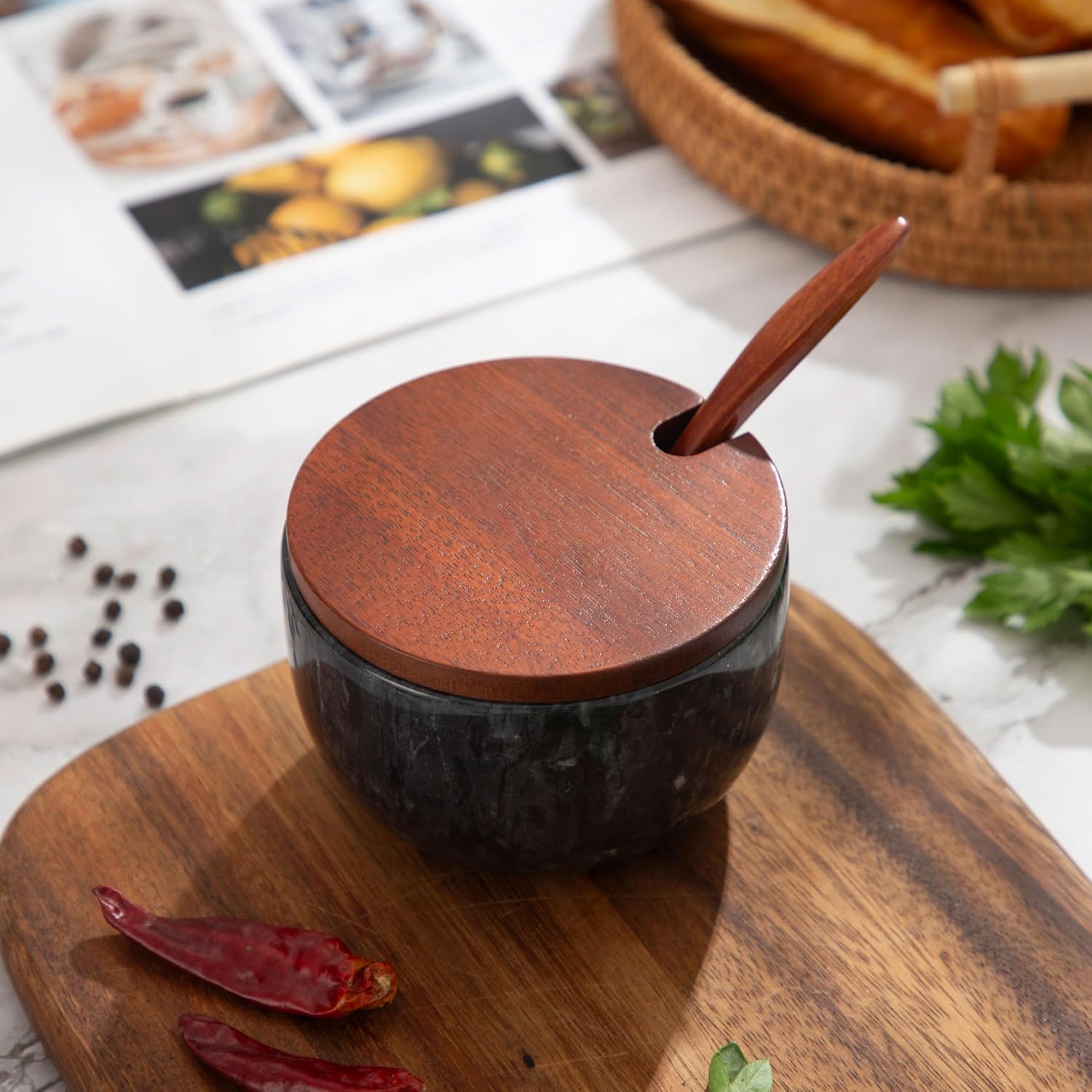 - The salt cellar is made of natural marble by hand grinding, with a polished exterior. Each is unique, and the cover is made of high-quality natural bamboo to keep out dust or bugs.