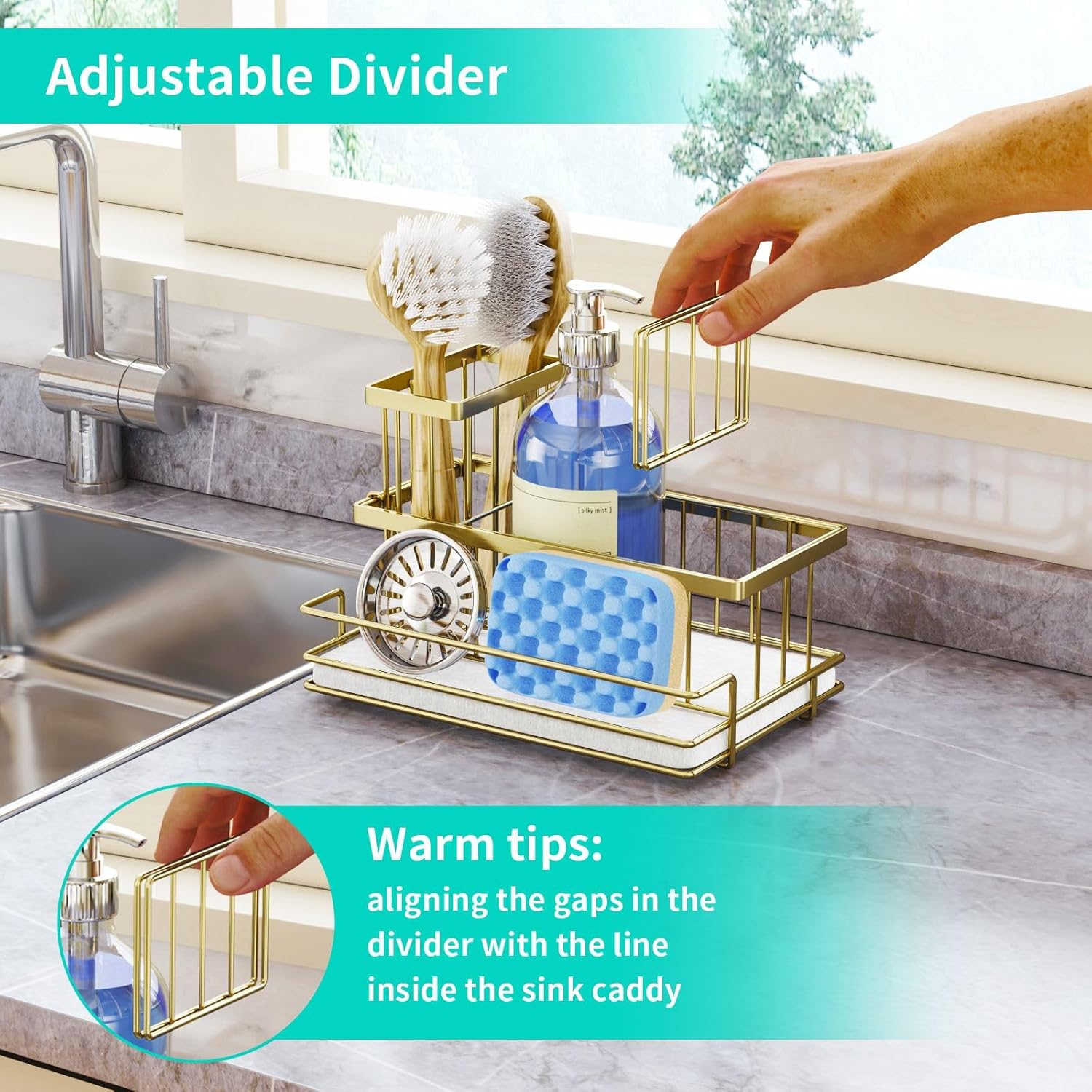 HapiRm Sink Caddy Sponge Holder - Kitchen Sink Organizer with Instant Drying Stone and Brush Holder, Stainless Steel Sponge Caddy for Kitchen Countertop - Gold