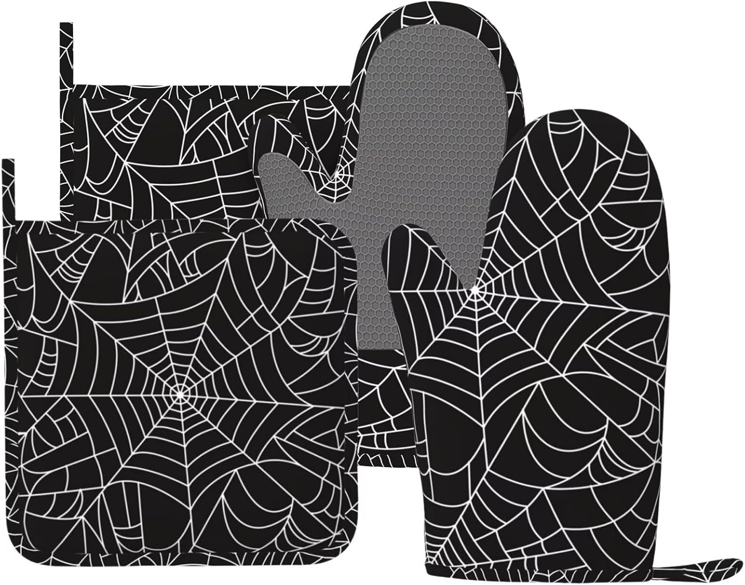 Black and White Spider Web Oven Mitts and Pot Holders Set of 4 Silicone Spiderwebs Kitchen Mitten Gloves and Non-Slip Potholders Set Heat Resistant Oven Gloves Hot Holders for Kitchen