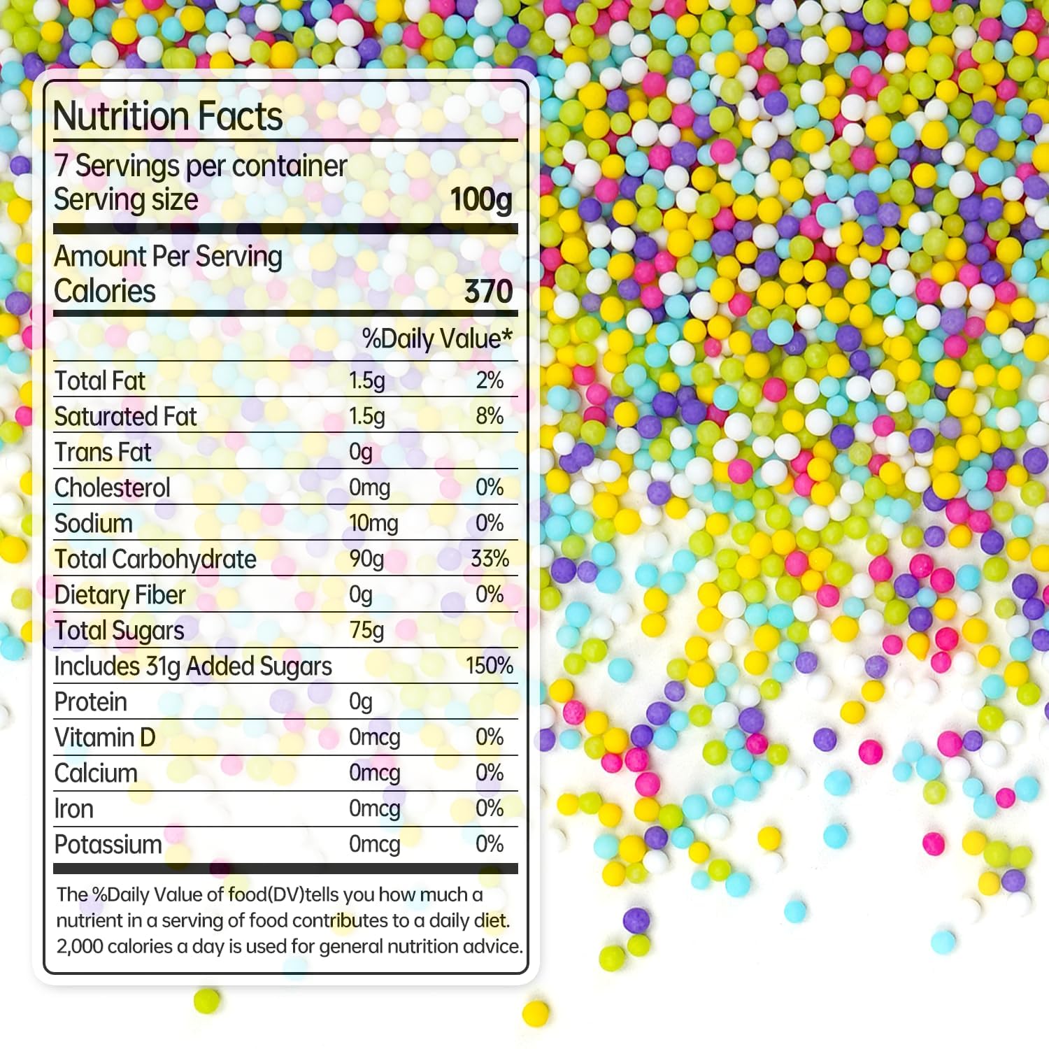 - The shelf life of these Rainbow Nonpareils Sprinkles is 24 months. Once you've opened the packet, you should store the remaining sprinkles in a cool, dry place and make sure the bag is sealed tightly. Do note that these edible easter sprinkles have a relatively firm texture. When savoring them, it's advisable to let them linger in your mouth for a moment, preventing any potential tooth discomfort.