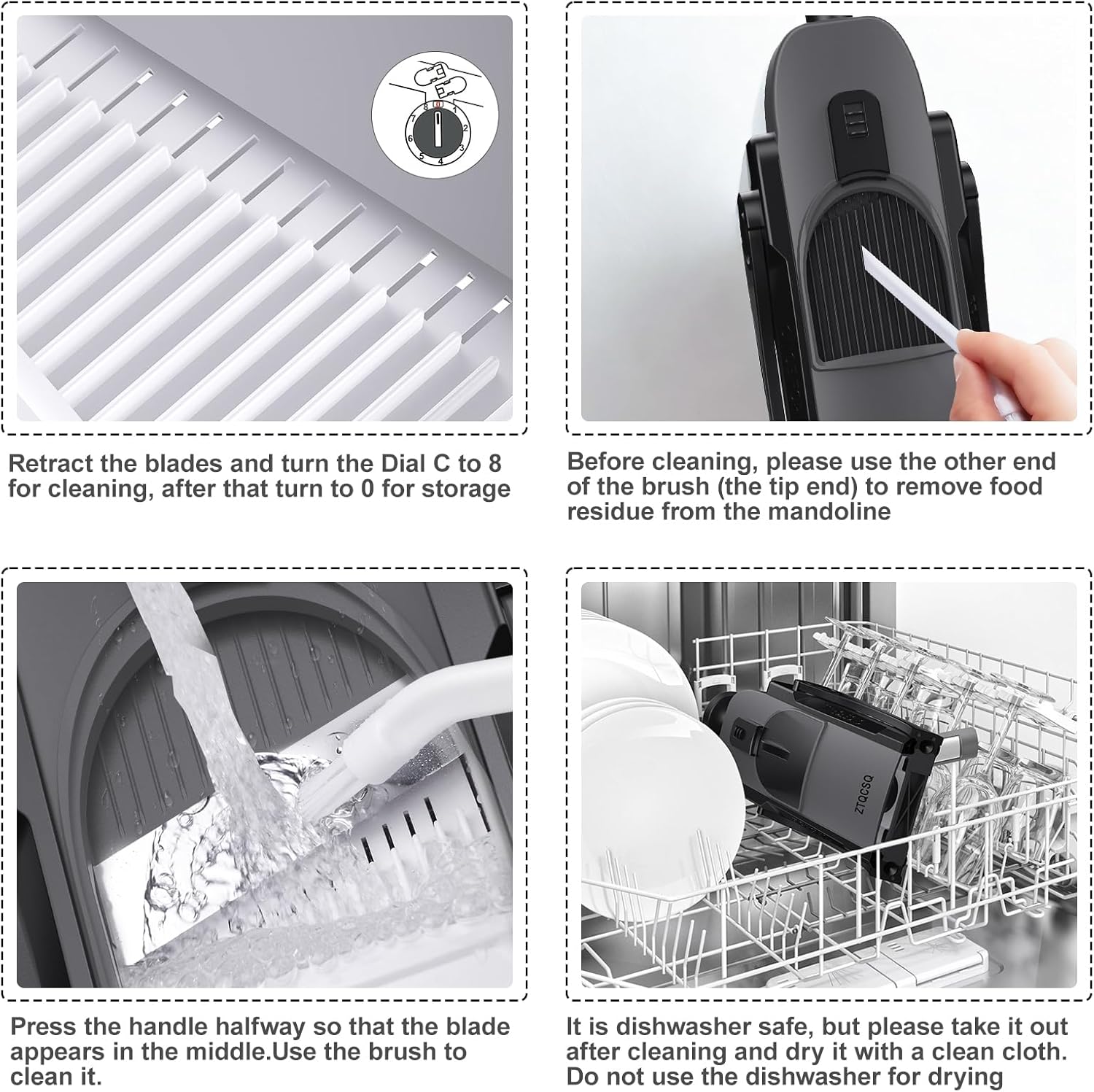 - 4. Easy to Use and Clean: Whether you’re preparing a quick breakfast or saving time on salads, this mandoline slicer simplifies your tasks. Its foldable, compact design takes up minimal cabinet space, and the included brush makes cleaning the blades effortless. It’s also dishwasher-safe for added convenience.