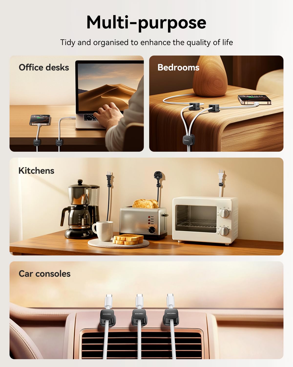 - High-Strength ABS Material: Rocoren magnetic cable management Passed 2000 gravity cycle tests (Lab-Tested Durability), the durability of the rubber material is 200% improved, and it is impact-resistant and corrosion-resistant. Installation tips: Please use alcohol cotton to clean the surface before use, press for 30 seconds to activate the glue, and let it stand for 12-24 hours to achieve the best viscosity (Maximum Adhesion)