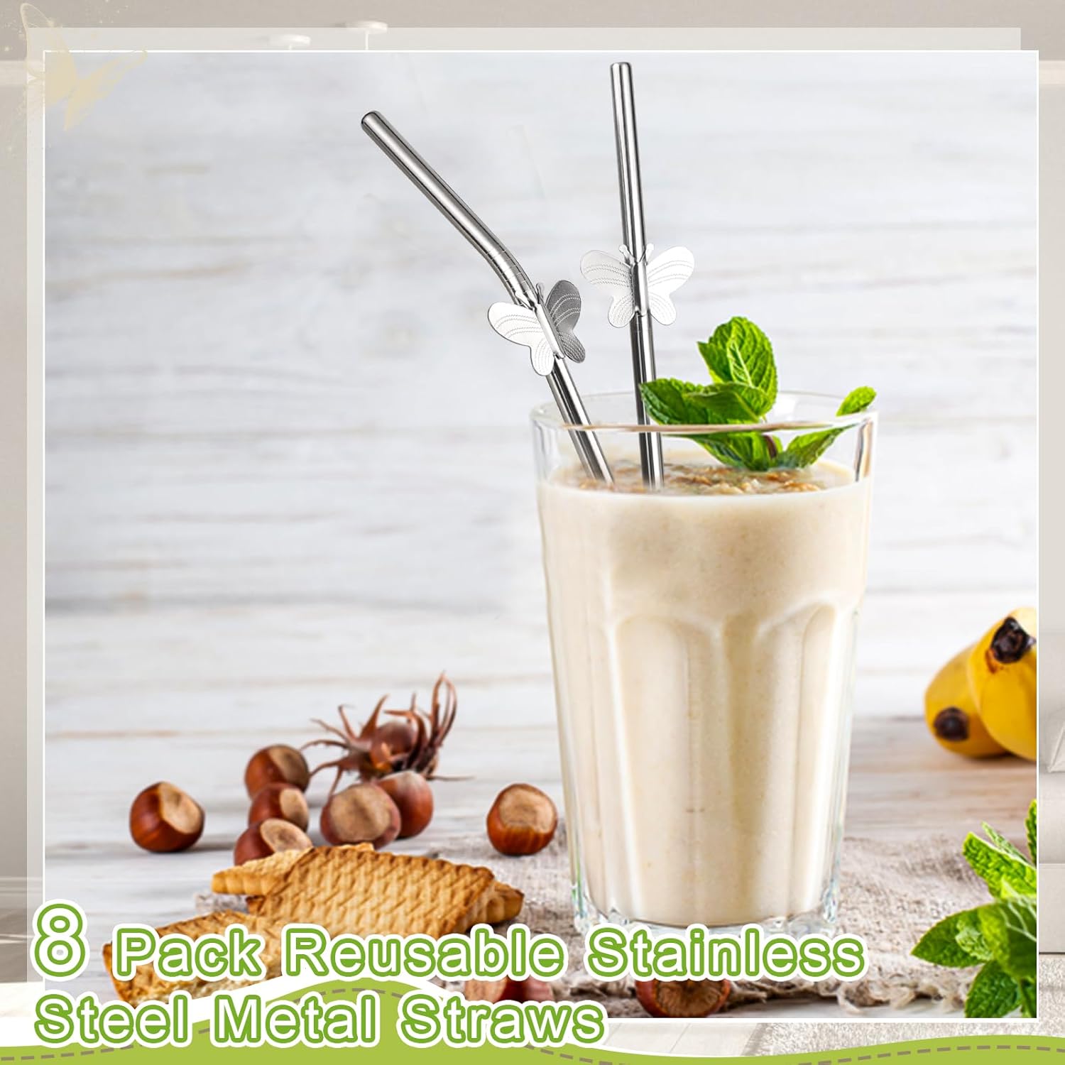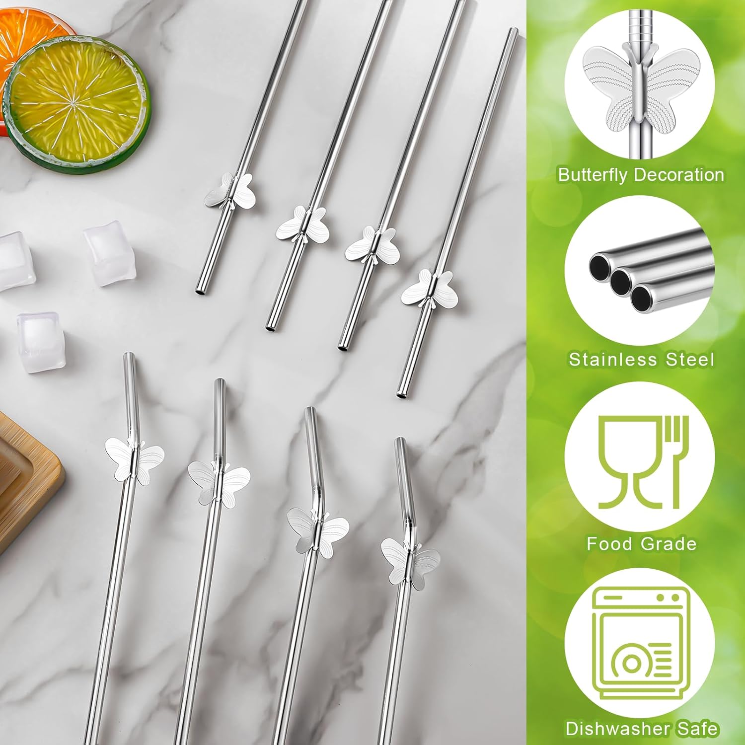8 Pack 8" Reusable Stainless Steel Metal Straws, 4 Straight + 4 Bent Metal Drinking Straws for Tumblers Beverage Drink with Butterfly Charms and 1 Cleaning Brush