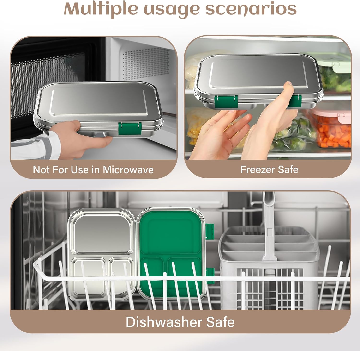 Stainless Steel Bento Box Kids, 3 Compartments Leak Proof Metal Bento Lunch Box, 304 Stainless Steel Bento Lunch Containers for School and Office,Dishwasher Safe, BPA-Free-Green