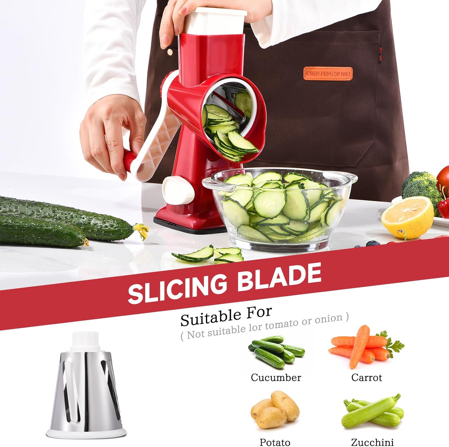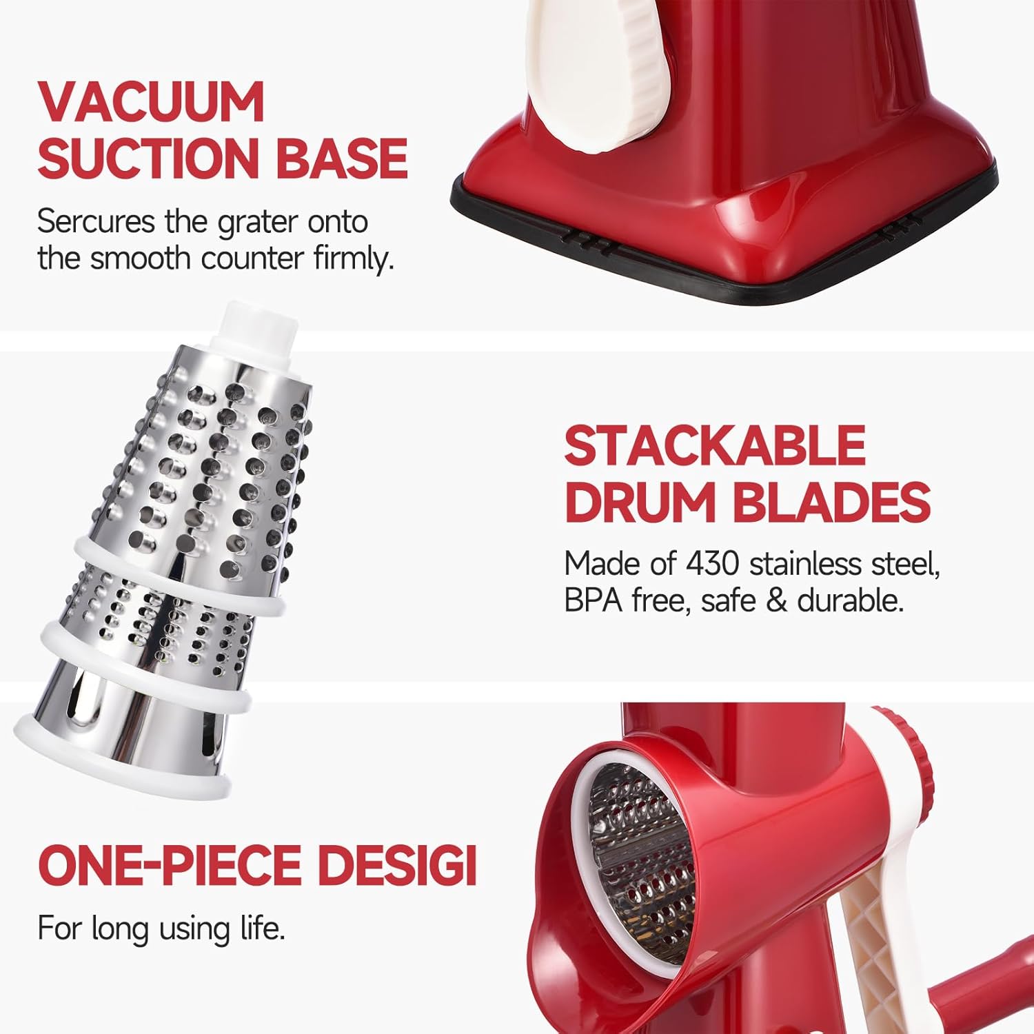 - 【Humanized Design】: Reasonable drum-type rotating vegetable shredder has powerful suction feet for stability on your table. The rotary cheese grater with handle is very efficient and easy to operate! The parts can be easily disassembled, It also saves storage space and makes your kitchen cabinet less crowded.