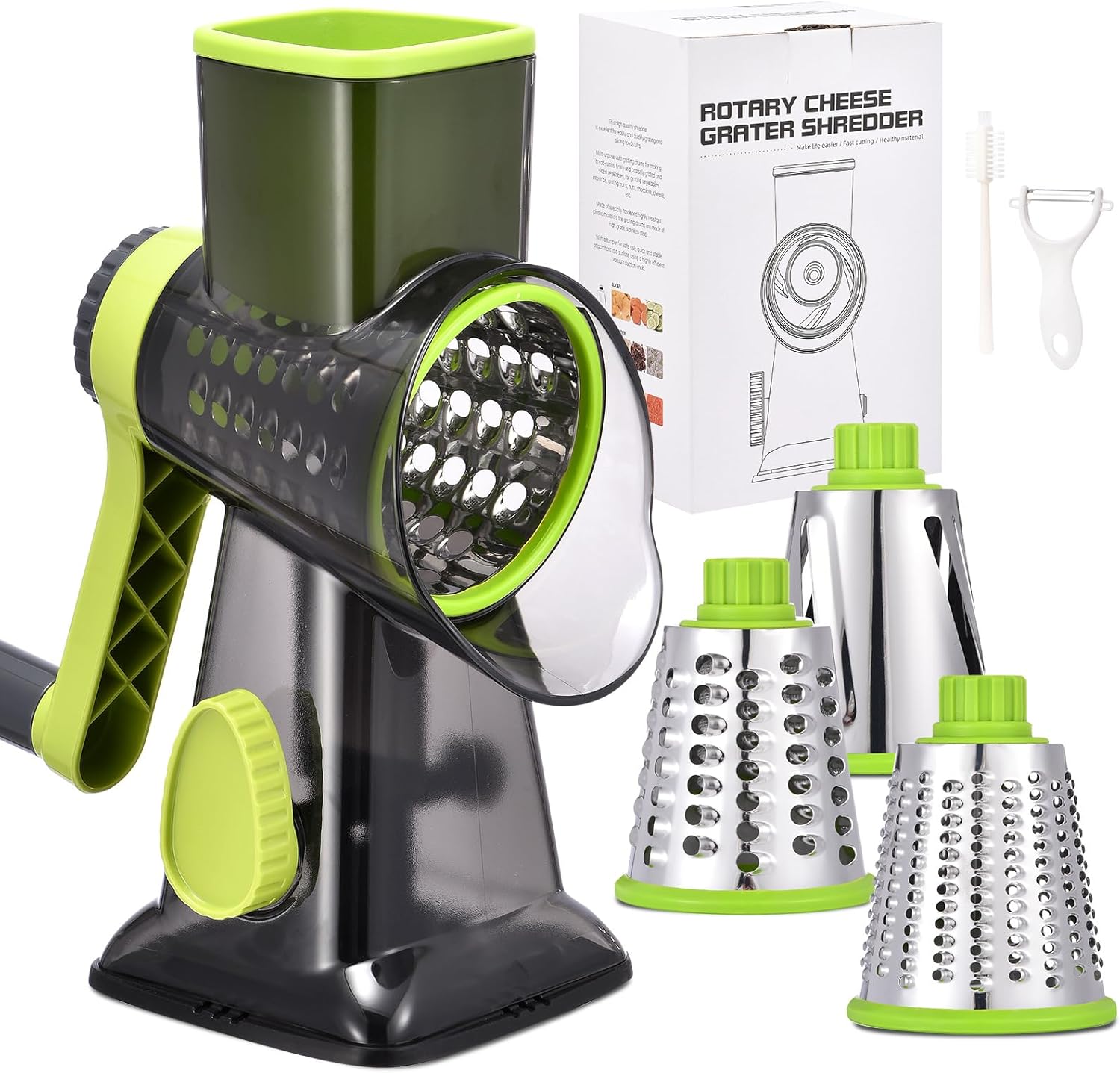 Rotary Cheese Grater Hand Crank Cheese Shredder Vegetable Mandoline Slicer for Kitchen 3 in 1 Changeable Blades for Cheese Potato Nuts Chocolate Ice (Green TSP)