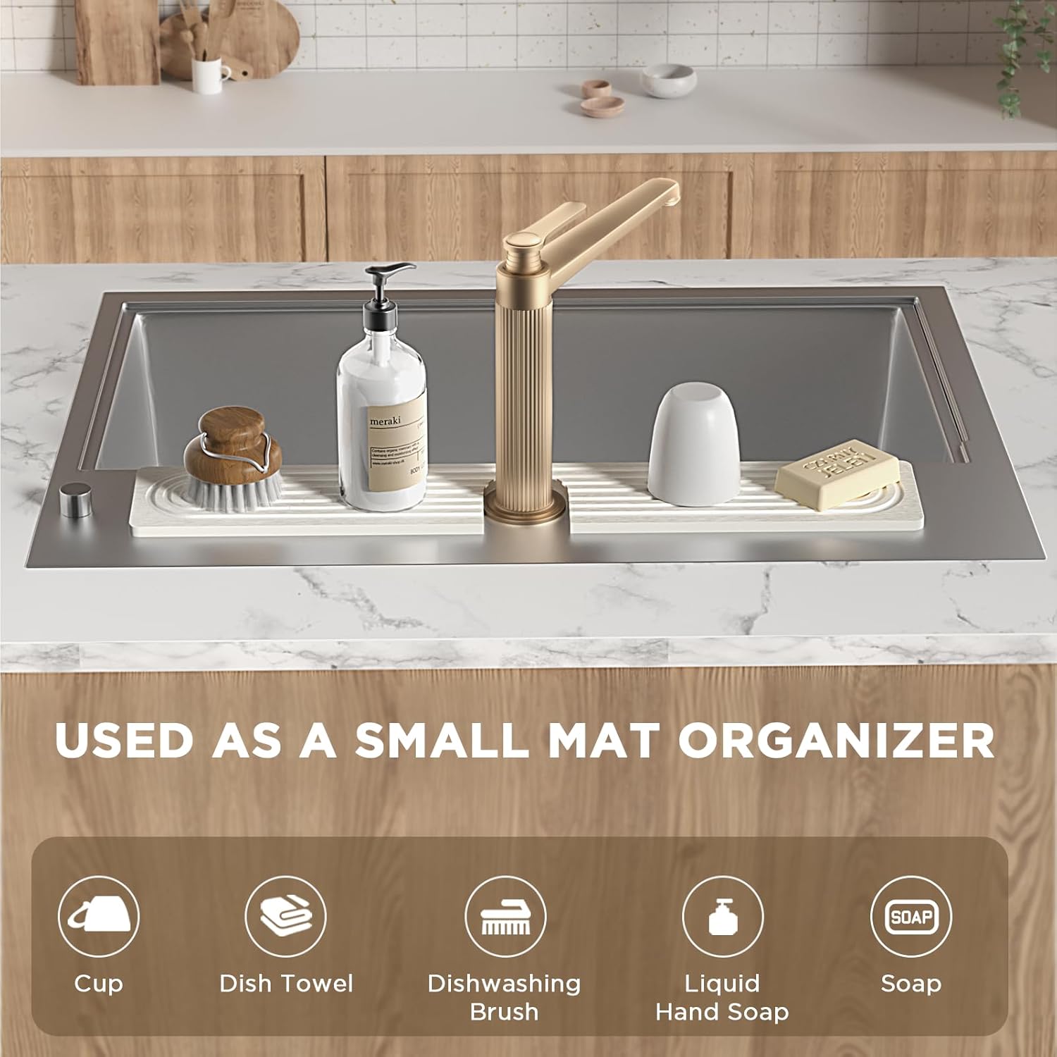 - 𝐒𝐢𝐧𝐤 𝐌𝐚𝐭 & 𝐎𝐫𝐠𝐚𝐧𝐢𝐳𝐞𝐫: This mat serves a dual purpose in your sink area. In addition to effectively absorbing water around the faucet, it functions as a practical holder for soap, toothbrushes, cups, dish sponges, and other items that require drying, keeping your countertops clean and dry