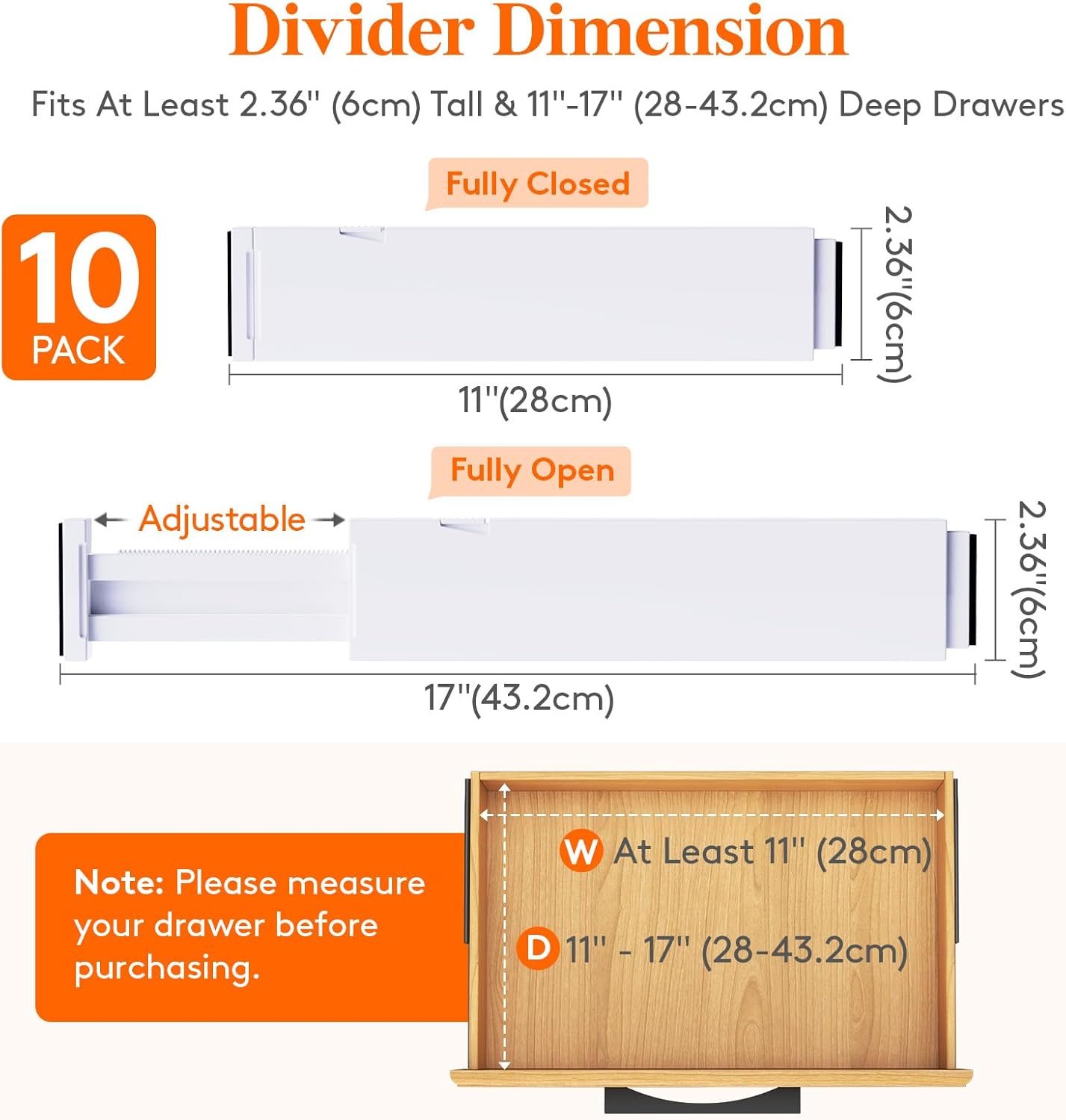 - Expandable and Adjustable: With a width of 0.8 inches, a height of 2.36 inches, and an adjustable length ranging from 11 to 17 inches, our drawer dividers fit most drawers and cabinets, keeping your items organized and drawers tidy