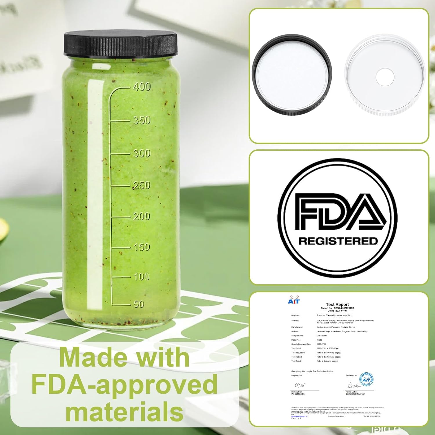Ruckae 16oz 12 Pack Juice Bottles, Glass Bottles Juicing with Lids, Smoothie Cup Lids and Straws, Water Bottle Mason Jar Drinking Glasses for Juicing, Smoothies, Kombucha