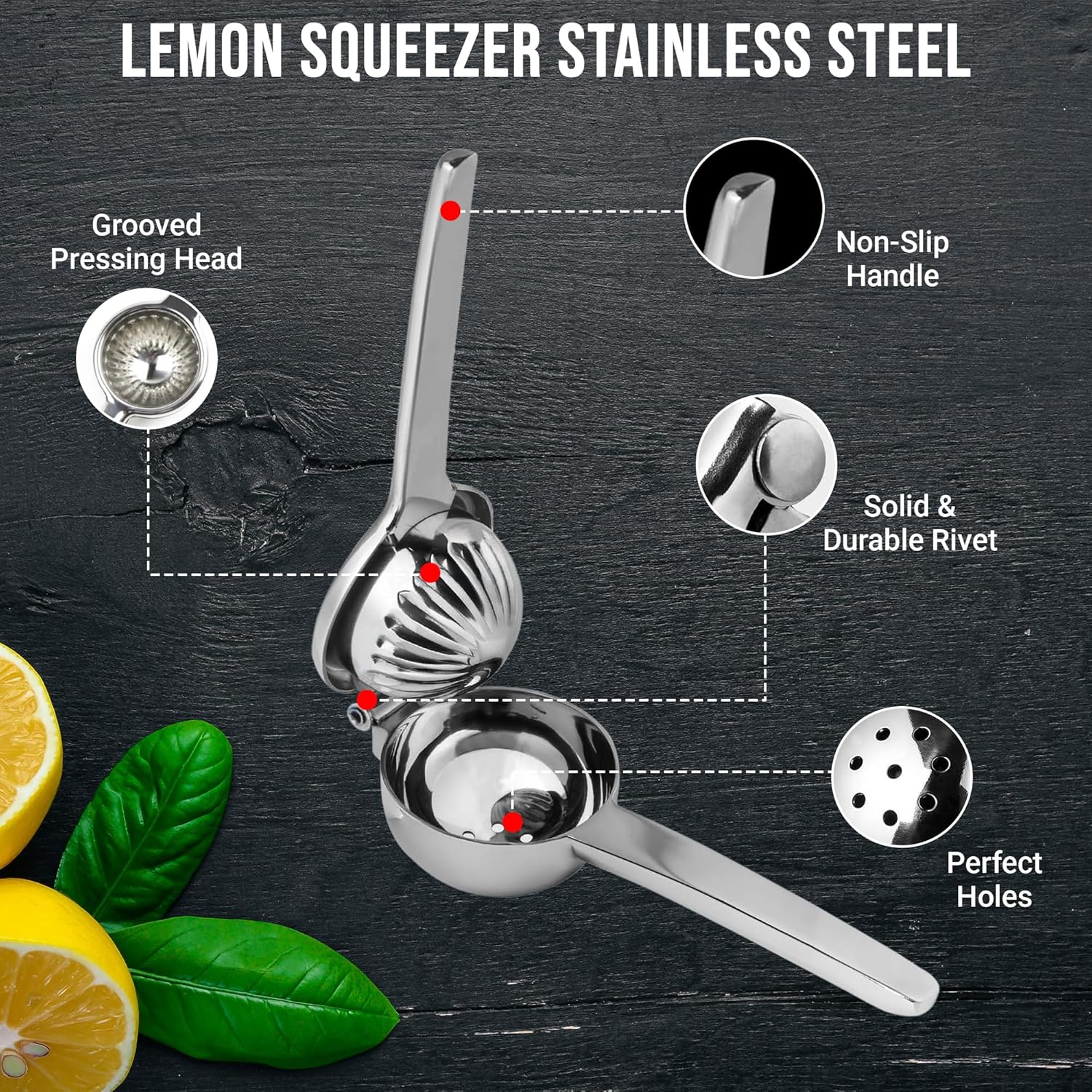 - π© HEAVY-DUTY STAINLESS STEEL DURABILITY β Built to last with premium food-grade materials, this stainless steel lemon squeezer resists corrosion, warping, and wear. Unlike flimsy aluminum options, our stainless steel lemon squeezers are rust-proof and dishwasher safe, giving you years of reliable use as a lime squeezer stainless steel or manual lemon juicer squeezer.