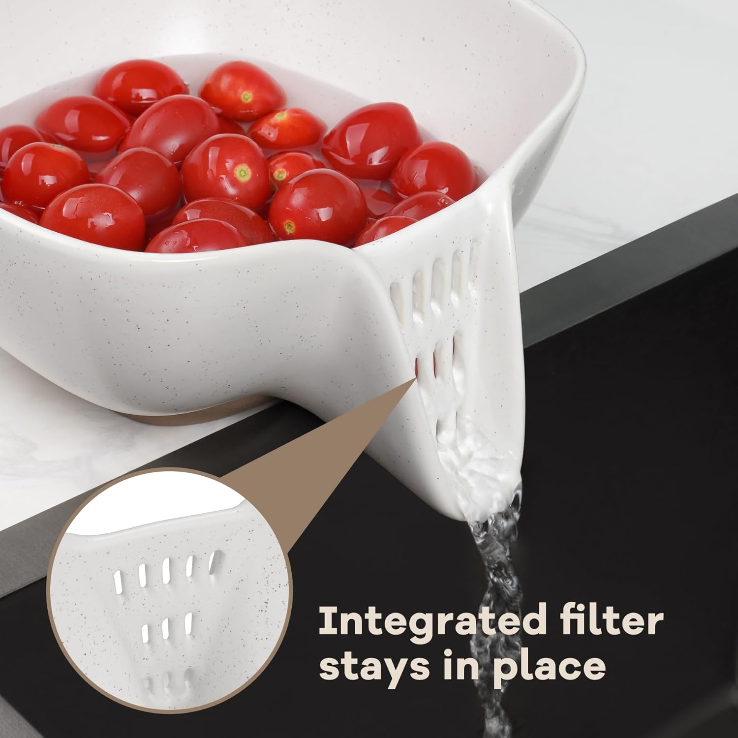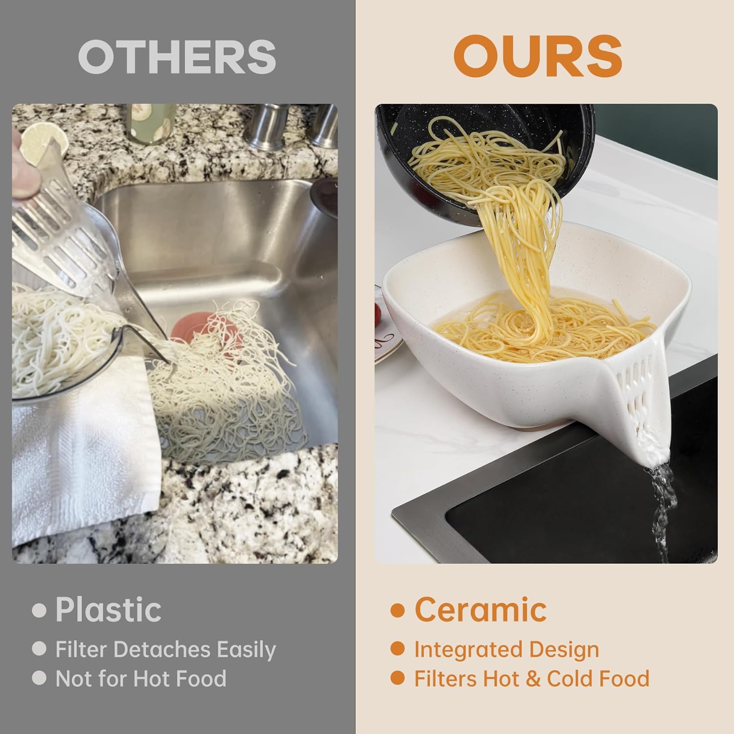 - Larger Size Design: Measuring 9.4x7.8 inches, this ceramic colander bowl is larger than typical bottom-drain products. It can be easily placed on the edge of the sink, making it ideal for rinsing and draining vegetables, fruits, pasta, and other foods, meeting a wide range of family needs.