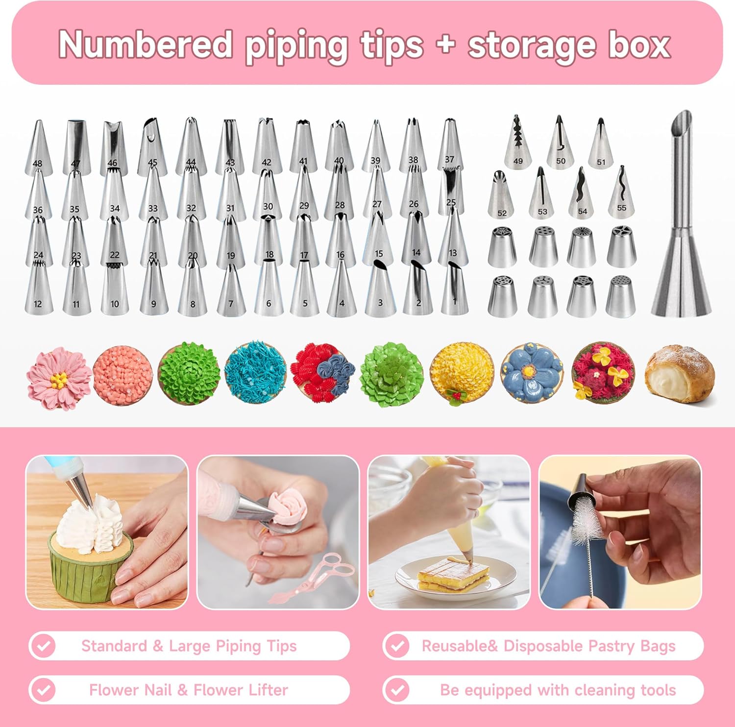 - CAKE DECORATING SUPPLIES FOR CAKE LOVERS: Whether it is lettering or frosting swirls when you are decorating cupcakes, pies, desserts & pastries; these fondant tools lets you decorate your tasty treats with ease,NUMBERED TIPS: We have selected top 63 tips including Round Tips, Leaf Tips, Petal Tips, French Tips, Basket Weave tips, open Star Tips close Star Tips, Drop Flower tips, use carefully selected stainless steel of 304 grade, Stainless steel tips with a handy re-usable storage case