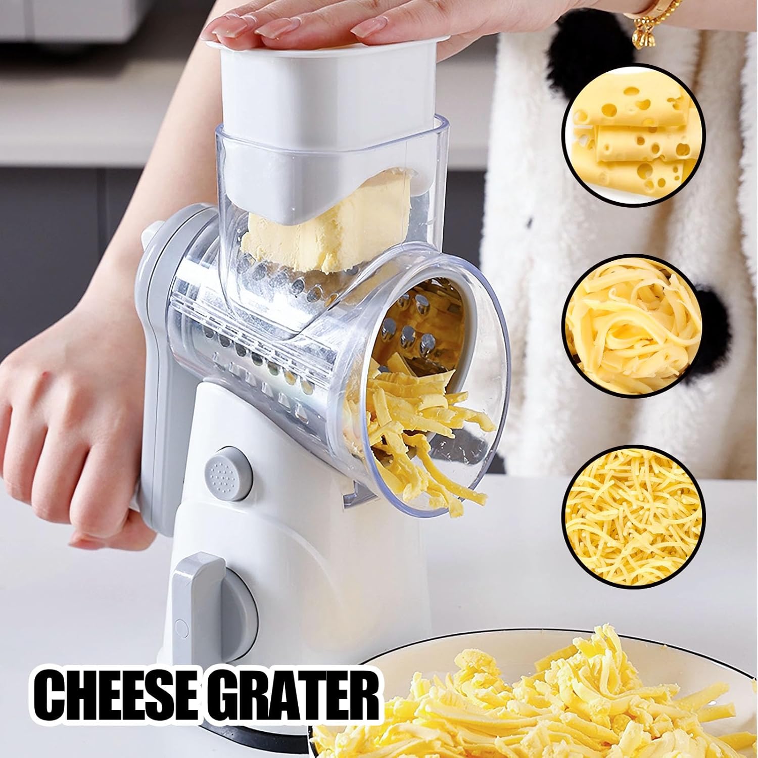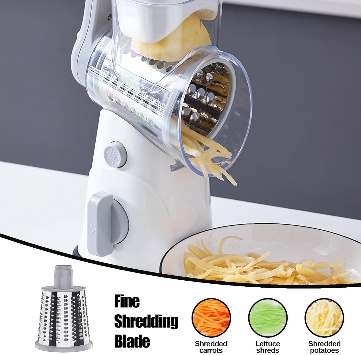- Grater for Kitchen: Suitable for vegetable shreds, slices, and grinding, all functions in one, saving kitchen cabinet space and not taking up room. The cheese grater's 3 interchangeable blades meet your needs for cutting food into the desired shape. Perfect for grinding cheese into powder, carrot shreds, and potato slices. Also suitable for cucumbers, zucchini, garlic, and even nuts