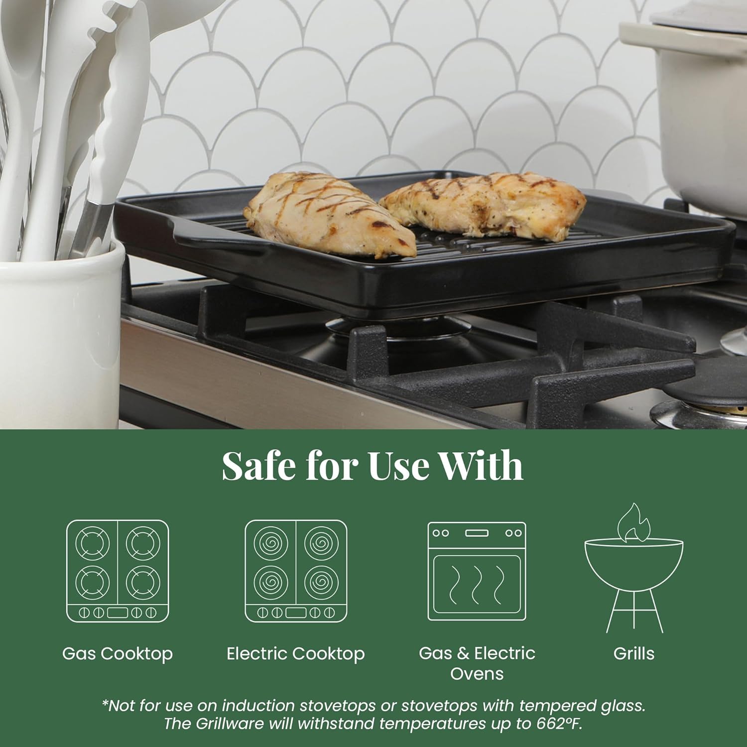 - Versatile Design: This 12.6 in x 10.6 in square ceramic grill pan is suitable for indoor/outdoor use on gas and electric stovetops or grills. Perfect for a wide range of recipes and cooking techniques such as searing, sautéing, baking, and broiling. Not suitable for induction stovetops or stovetops with tempered glass.