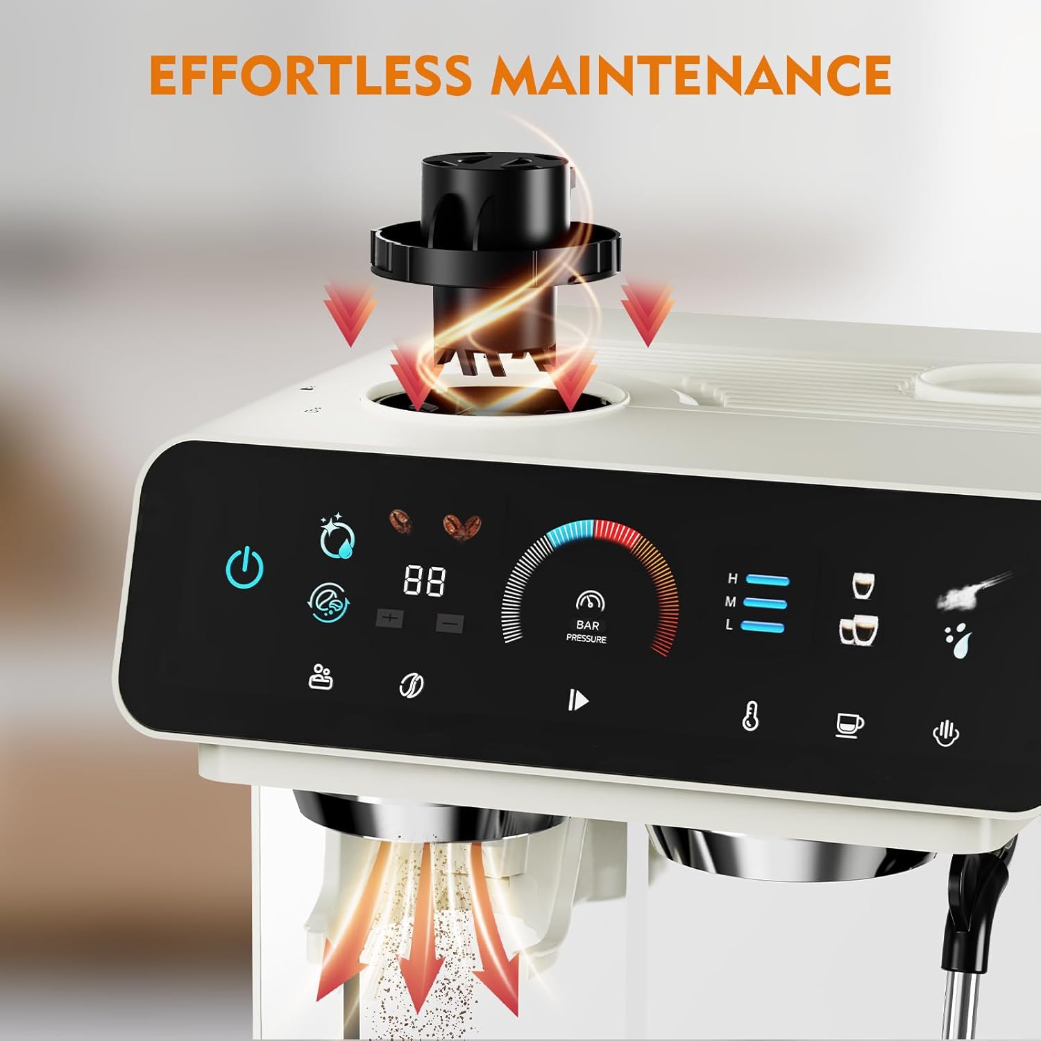 - Built-in Grinder With Cleaning Kits: Integrated conical burr grinder with 19 grinding sizes to fine tune your grind size for the desired extraction and flavour outcome,while included self-cleaning kit automatically clears residual grounds—no more daily disassembly or clogged grinders