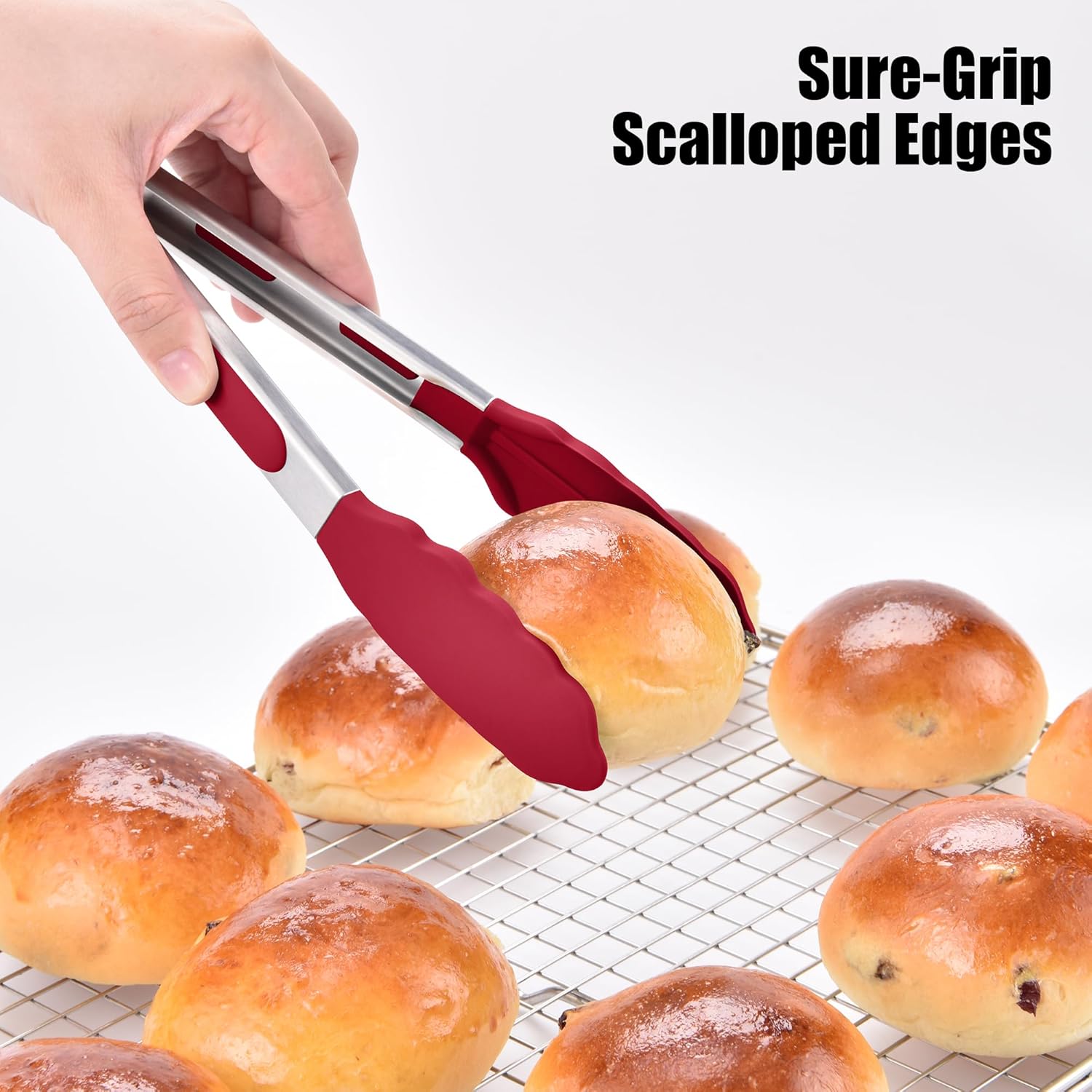 Doosu Kitchen Tongs for Cooking - 600°F Heat Resistant Food Tong with Non-Scratch Silicone Tips, Heavy Duty Stainless Steel Locking Tong for BBQ, Grilling Steak, Serving Salad, Pasta (9in, Red)