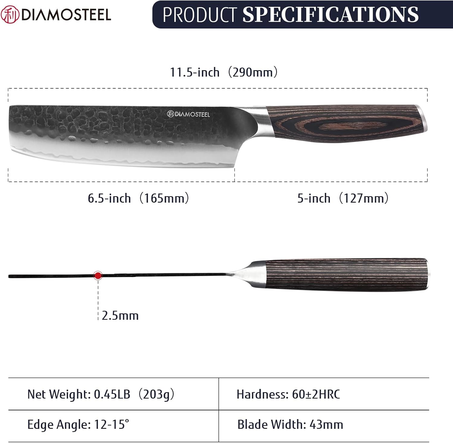 - Premium Triple-Layer Steel Blade - Say goodbye to dull kitchen knives. Our Diamosteel nakiri knife is crafted from high-quality 9CR18MOV three-layer composite steel, boasting a sharp edge honed to 12-15Β° and a hardness rating of HRC58-60. This ensures superior edge retention and rust resistance, making it your dependable cooking knife for years of precise slicing and dicing.