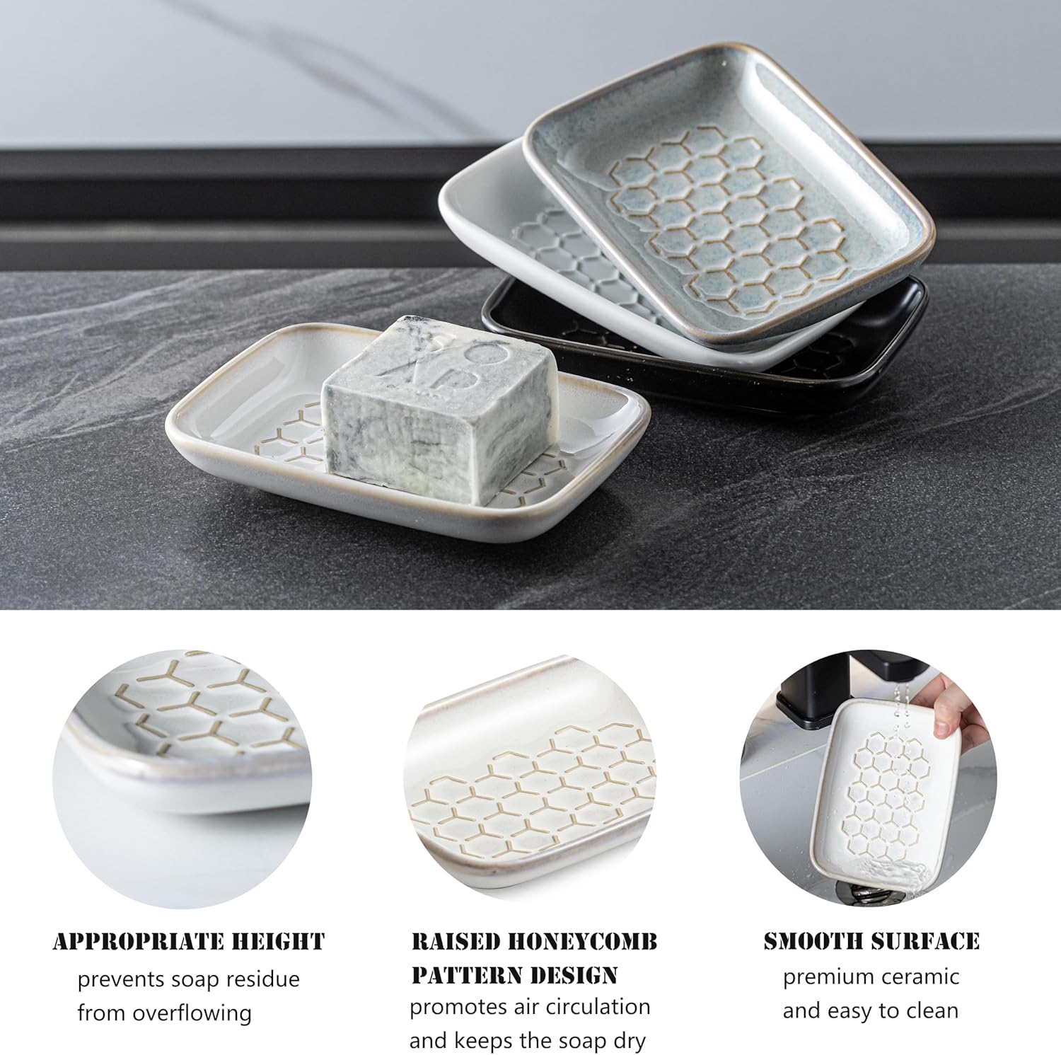 - NON-SLIP STABILITY: This bar soap holder offers excellent non-slip functionality. The raised honeycomb pattern on the inside holds the wet soap firmly in place, preventing it from slipping out of the tray. Its unglazed bottom ensures the stability of the ceramic soap dish and prevents the dish from accidentally slipping into the sink, making it ideal for use on bathroom and kitchen countertops.