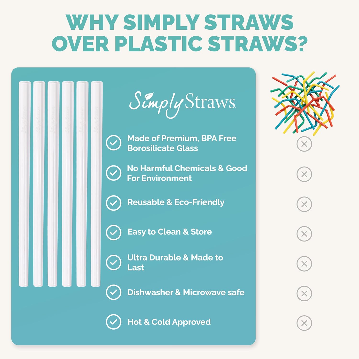 Simply Straws Wide Glass Straws (6-Pack) - 10in x 12mm Reusable Glass Smoothie Straws for Milkshakes, Juices & Slushies, with Cleaning Brush - Dishwasher Safe, Hot & Cold Use, BPA-Free (Air)