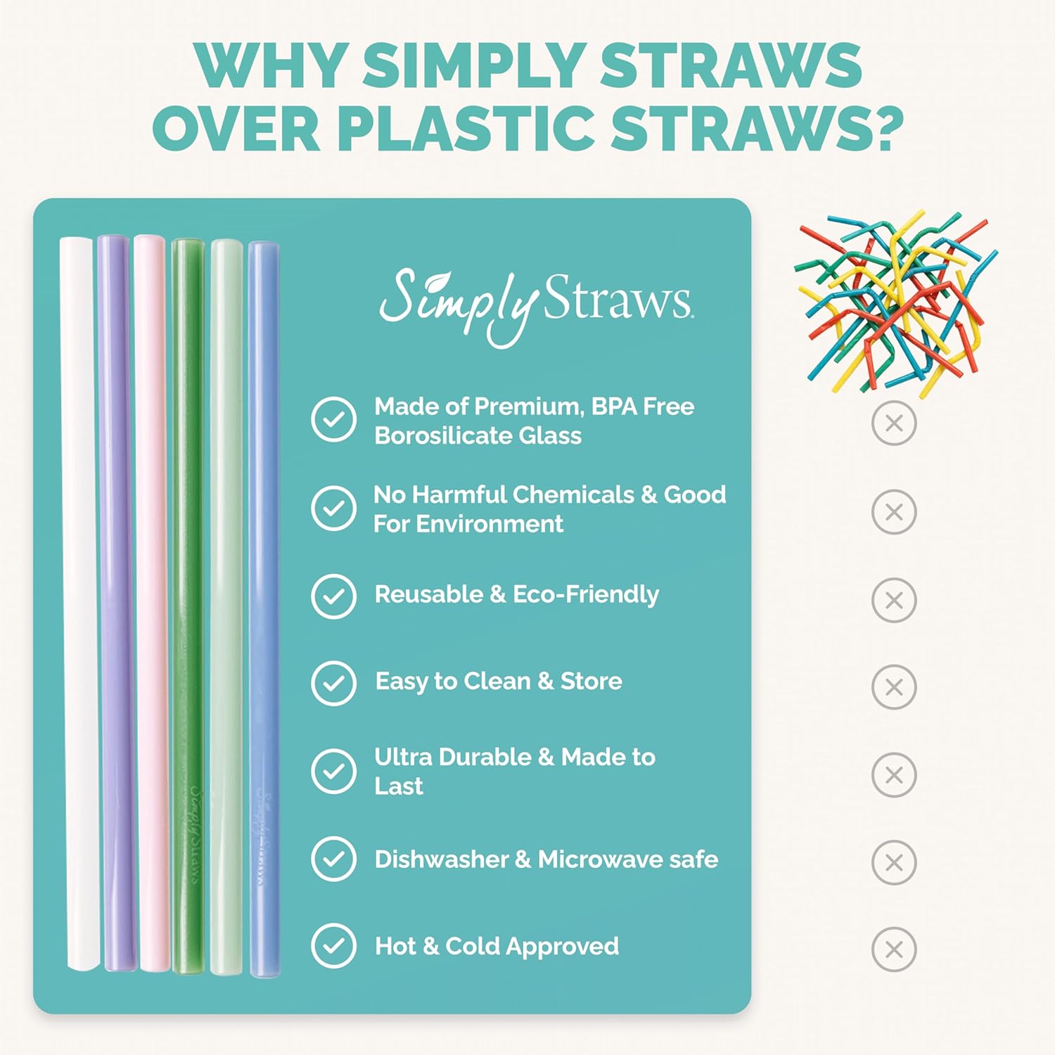 Simply Straws 8 Inch Glass Straws Straight (6-Pack) – Reusable Glass Straws for Pints & Juice Drinkware, with Cleaning Brush – Dishwasher Safe, Hot & Cold Use, BPA-Free (Cote d'Azur)