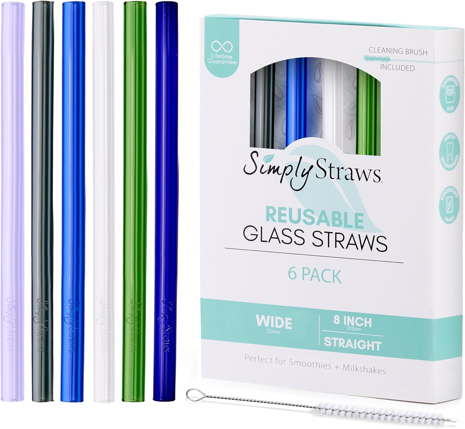 Simply Straws 8 Inch Wide Glass Straws (6-Pack) - 12mm Reusable Boba Straws for Milkshakes & Smoothies, with Cleaning Brush - Dishwasher Safe, Hot & Cold Use, BPA-Free (Seaglass)