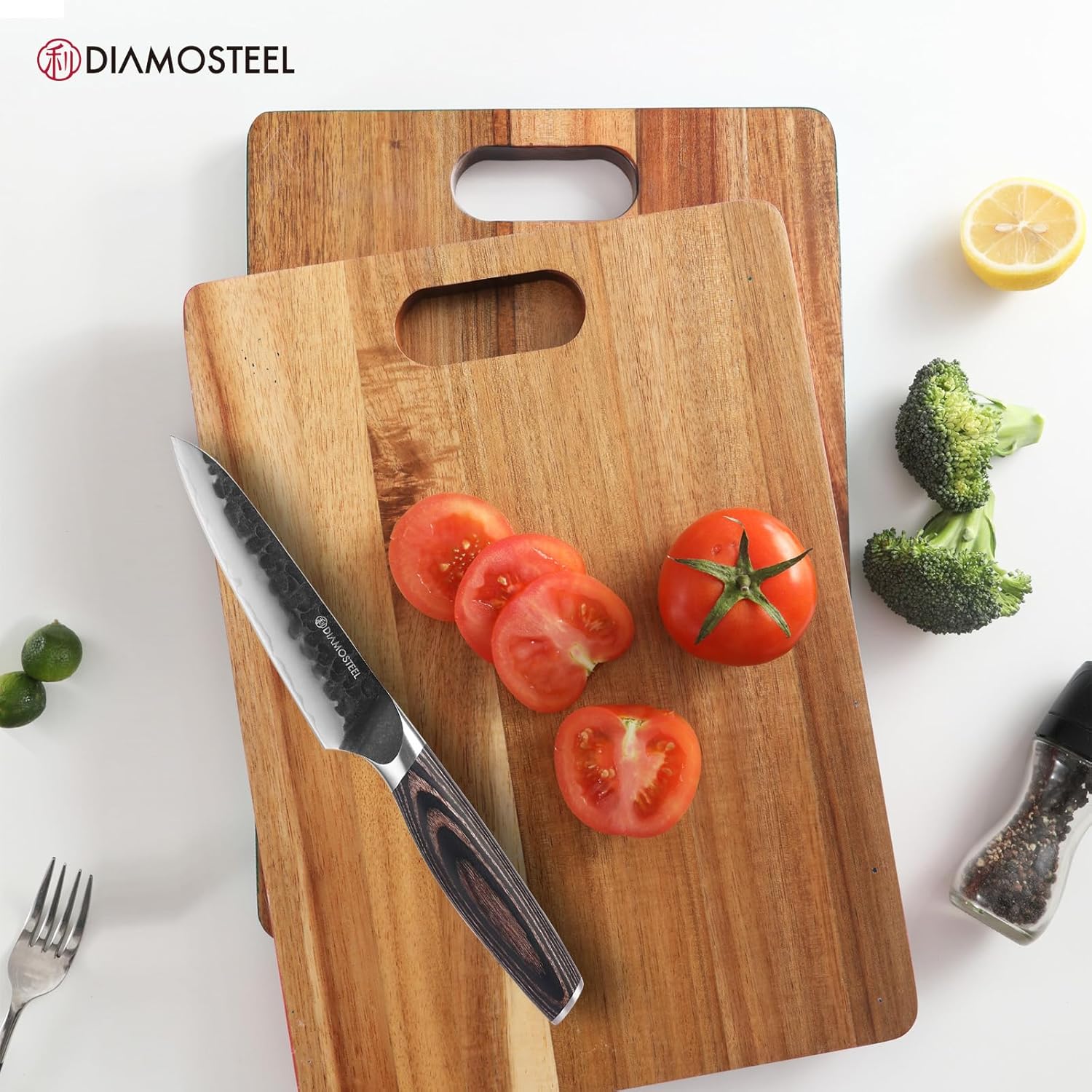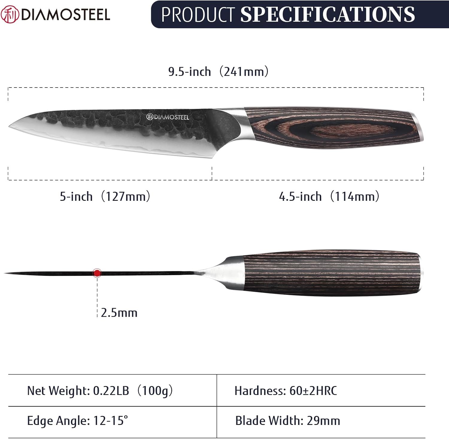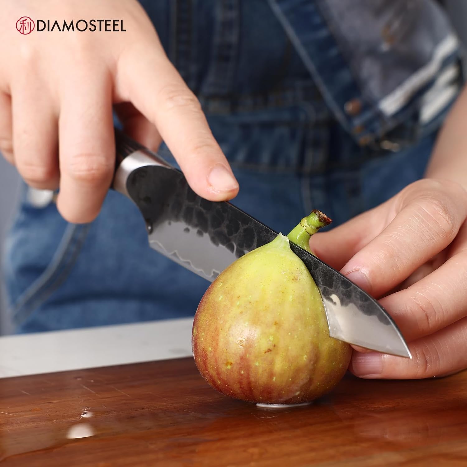 - Premium Triple-Layer Steel Blade - Say goodbye to dull kitchen knives. Our Diamosteel kitchen utility knife is crafted from high-quality 9CR18MOV three-layer composite steel, boasting a sharp edge honed to 12-15Β° and a hardness rating of HRC58-62. This ensures superior edge retention and rust resistance, making it your dependable cooking knife for years of precise slicing and dicing.